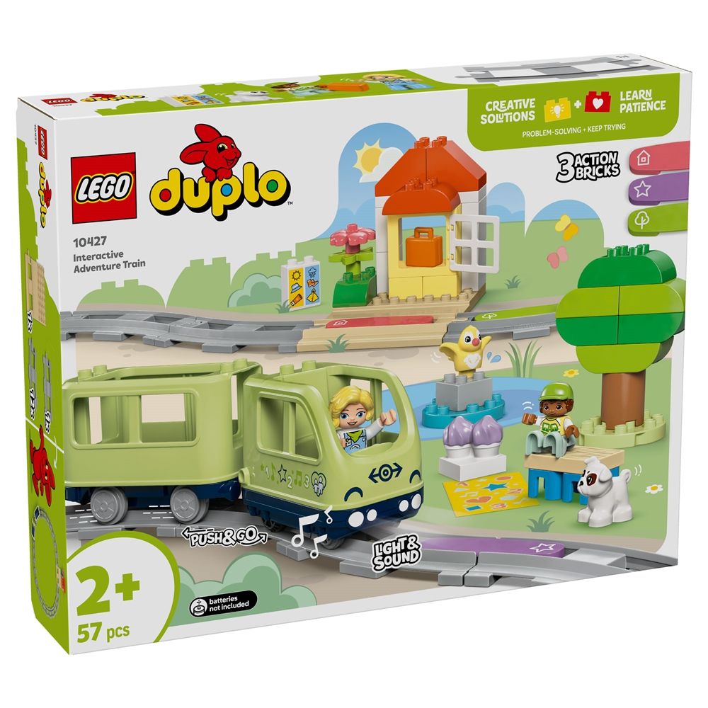 Forside » Alle LEGO produkter LEGO DUPLO - Interaktivt oplevelsestog - 10427 - 57 dele Duplo Skarp pris: 599,00DKK Få på lager Trustpilot Antal Læg i kurv Se mere fra: Duplo Artikelnummer: LEG10427 Har du spørgsmål til produktet? Små børn kan sætte sig i førersædet med legetøjet Interaktivt oplevelsestog. Med dette toglegetøj kan de mindste bestemme, hvor turen går hen, og derefter begive sig ud på en rejse fyldt med lys, lyde og læring. Bygge- og ombygningslegetøjet indeholder klodser til at bygge en park, strand, togstation eller familiens hjem, så tumlinger skærper nysgerrigheden og finder kreative måder at bygge på. Læringslegetøjet øger børns tålmodighed og styrker finmotorikken og kreativiteten, når de fokuserer på at bygge togbanen og lave en rute for passagertoget. De 3 funktionsklodser gør legen levende, og legetøjstoget laver realistiske lyde, når det kører hen over dem - bruger 4 stk. AAA-batterier (medfølger ikke). De kan også bruge den særlige tilpasningsklods til at afspille deres egne lyde, der kan optages med den gratis LEGO® DUPLO® app Interactive Trains, og de kan køre toget ved hjælp af en bærbar elektronisk enhed. Tilbage til Alle LEGO produkter
