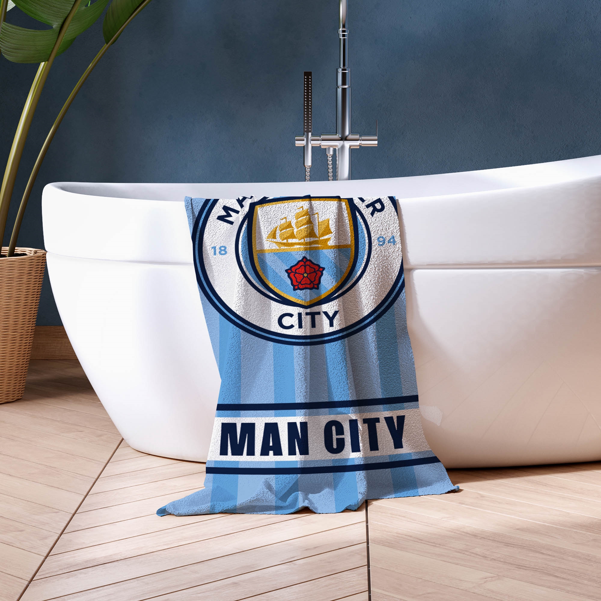 Forside » Indretning » Badeværelses tilbehør » Håndklæde størrelser » Badehåndklæder 70x140 cm Manchester City håndklæde - 70x140 cm - 100% bomuld - Blødt badehåndklæde med Manchester City logo Spar25% Licens 199,95149,95DKKSpar 50,- På lager Trustpilot Antal Læg i kurv Se mere fra: Licens Artikelnummer: 22283 Læs vores håndklæde guide Se vores udvalg af håndklæderpakker Se vores udvalg af badeponchoer til børn Har du spørgsmål til produktet? God absorberingBlødt & behageligtOEKO-TEX® - Fri for kemi Størrelse: 70x140 cm Type: Badehåndklæde Design: Manchester City Strop til ophæng: Ja, top Kvalitet: 100% blød bomuld Vask: 40° Tørretumbling: Ja Certificering: STANDARD 100 by OEKO-TEX® (11-31077 Shirley). Din garanti for at produktet er fri for sundhedsskadelig kemi. Blødt badehåndklæde i 100% bomuld, med motiv af Manchester City logo. Håndklædets fodbold motiv, vil helt sikkert bringe et smil frem på den lille fodboldfan så badetid bliver sjovere. Balancen i naturlig komfort fra det bløde materiale og det hyggelige fodbold design, gør dette håndklæde til en sikker favorit hos dit barn. Vi anbefaler, at nye håndklæder lægges i blød i koldt vand før første vask - således optimere du håndklædernes absorberingsevne. Dette Manchester City håndklæde er en nem opgradering af det kedelige badehåndklæde, samt gør badetid mere interessant og personlig. Håndklædets fodbold motiv, vil helt sikkert vække begejstring hos den lille fodboldfan. Børnehåndklædet er lavet af 100% bomuld, hvilket betyder, at det er dejlig blødt og behageligt at bruge. Bomuld er et naturligt blødt materiale, der er skånsomt mod huden, herudover er materialet kendt for sin høje absorberingsevne. Badehåndklædet er udstyret med en strop, hvilket gør det nemt at hænge det op når det skal tørre. Find lækre badekåber her Håndklædet er OEKO-TEX certificeret, hvilket betyder, at det er testet fri for sundhedsskadelige kemikalier. Dette er et tegn på ansvarlig produktion, som ikke kun gavner miljøet, men også for vores krop og hud, da det reducerer risikoen for allergiske reaktioner. Find alt til badeværelset her Tilbage til Badehåndklæder 70x140 cm