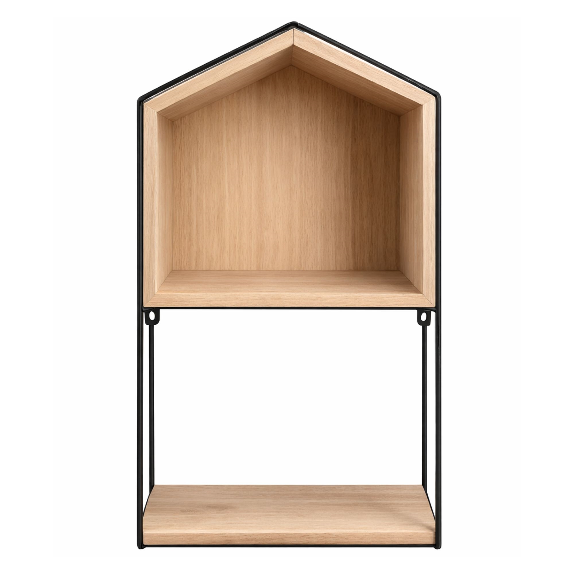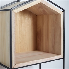 Denne væghylde er både praktisk og stilfuld. Den er fremstillet af sortlakeret metal og træ, hvilket giver en flot kontrast og et moderne udtryk. Hylden kan bruges til at udstille dine yndlingsgenstande eller til opbevaring af nødvendigheder inden for rækkevidde.