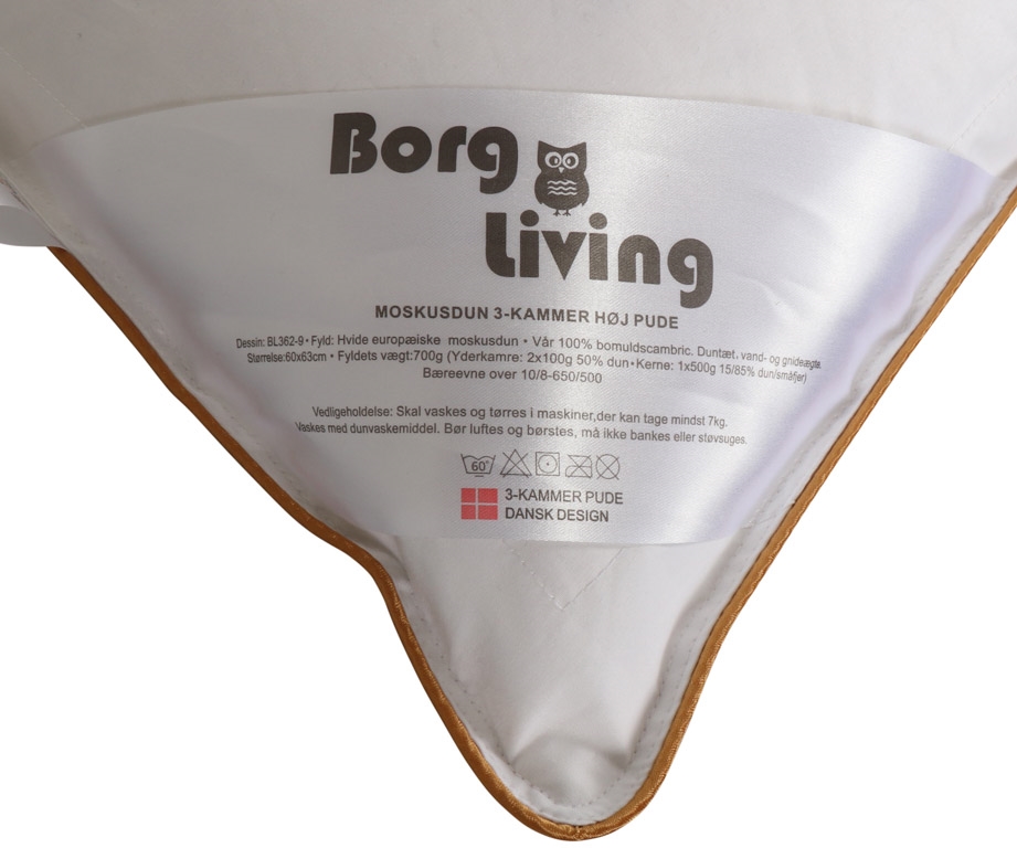 Forside » Hovedpuder » Størrelse » Puder 50x70 cm (Norsk) Moskusdun hovedpude - Høj - 50x70 cm - 3 kamre hovedpude - Borg Living Spar63% Borg Living 799,95295,00DKKSpar 505,- På lager Trustpilot Antal Læg i kurv Se mere fra: Borg Living Artikelnummer: BL362-10 Læs vores pudeguide Læs om vedligeholdelse af dyner og puder Se vores store udvalg af pudebetræk Har du spørgsmål til produktet? Moskusdun pude 3 kamreBæreevne: Over 10Borg Living Størrelse: 50x70 cm Type: Høj hovedpude Konstruktion: 3 kamre pude Brand: Borg Living Fyldvægt: 660g Yderkammer: 2x95g moskusdun Fyld i kernen: 470g andedun/småfjer Yderkammer: Over 10 (Gammel målemetode) 650 (Ny målemetode) Kernen: Over 8 (Gammel målemetode) 500 (Ny målemetode) Bolster: 100% duntæt bomulds cambric. Vask: 60° (Vigtigt at anvende Enzymfrit vaskemiddel) Tørretumbling: Skal tørretumbles med tørrebolde Garanti: 2 år Certificering: STANDARD 100 by OEKO-TEX® (HKX 19275) Hovepuden er konstrueret med 3 kamre. De to yderste er fyldt med bløde edderduns lignende moskusdun, imens kammeret i midten er fyldt med støttende småfjer. Med en 3-kammer pude får din nakke og skuldre den støtte, du behøver for at ligge behageligt hele natten uden at skulle bakse med puden for at få den til at ligge ordentligt. Pga. sin særlige konstruktion holder puden nemlig sin form. Se vores store udvalg af sengetøj i 140x200 cm her Det danske brand Borg Living producerer eksklusive serier af dyner, puder og boligtekstiler til dit hjem. Brandet som er etableret i 2013 og er bl.a. kendt for deres nytænkning indenfor kvalitet og design. Borg Livings fantastiske produkter, bidrager til en optimal og behagelig nattesøvn samt udsmykker dit hjem med moderne og lækkert boligtilbehør. Tilbage til Puder 50x70 cm (Norsk)