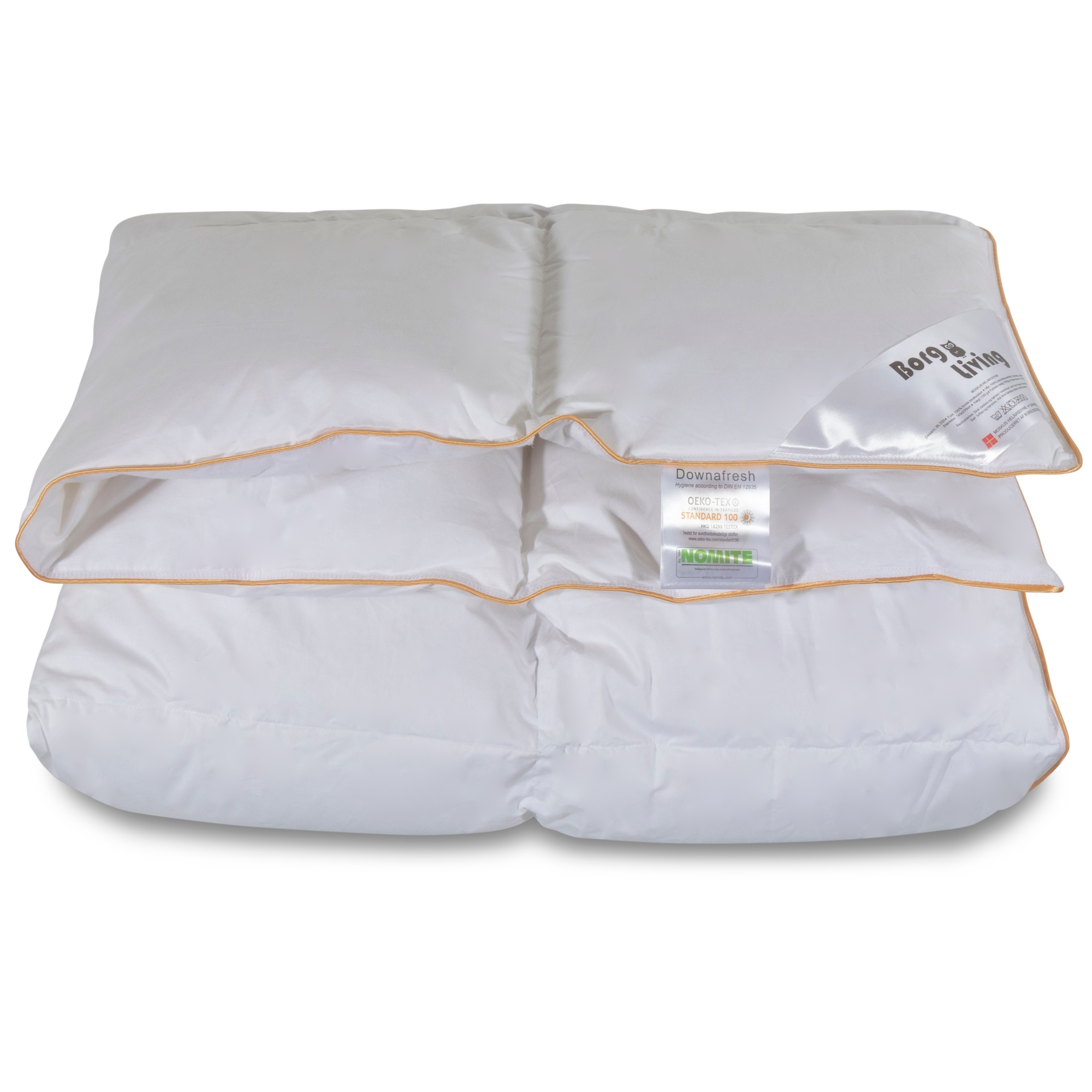 Forside » Dyner » Enkelt dyner » Enkelt dyne 150x210 cm (Svensk mål) Moskusdundyne 150x210cm - Helårsdyne - Borg Living Spar73% Borg Living 3.299,95895,00DKKSpar 2.405,- Gratis fragt på denne varePå lager Trustpilot Vælg størrelse Vælg variant Antal Læg i kurv Se mere fra: Borg Living Artikelnummer: BL-226 Læs vores dyneguide Læs om vedligeholdelse af dyner og puder Se vores store udvalg af puder Har du spørgsmål til produktet? Moskusdundyne -Borg LivingBæreevne: Over 12100% Moskusdun Størrelse: 150x210 cm Type: Helårs dyne Fyld: 100% Europæiske hvide moskusdun Brand: Borg Living Fyldvægt: 660 g Bæreevne: Over 12 (Gammel målemetode) Bæreevne: 800 (Ny målemetode) Bolster: 100% duntæt bomulds cambric Konstruktion: 4x6 Kassettedyne med guld piping kant Vask: 60° (Vigtigt at anvende Enzymfrit vaskemiddel) Tørretumbling: Tørretumbles med tørrebolde Garanti: 5 år Certificering: STANDARD 100 by OEKO-TEX®. (1176-194) Certificering: NOMITE - Fri for husstøvmider Certificering: Downafresh -100% rene dun Se alle vores hovedpuder her Moskusdun minder om de eksklusive edderdun, fordi de giver bløde, lette og luftige dyner. Derudover gør moskusdun at dynen varmer godt. Fugt bliver også optaget af dynen så du ikke bliver helt fugtig, hvis du har det lidt varmt om natten. Det gør alt i alt, at dynen er behagelig at sove med. Se vores store udvalg af sengetøj i størrelsen 150x210 cm her Dynen er i blødt bolster med 100% duntæt bomuldscambric og er så tætvævet, at støvmider ikke kan trænge igennem. Dynen er syet i kassetter med guld piping-kant og er med kanalvægge, så dunene isolerer uden kuldebroer. Det danske brand Borg Living producerer eksklusive serier af dyner, puder og boligtekstiler til dit hjem. Brandet som er etableret i 2013 og er bl.a. kendt for deres nytænkning indenfor kvalitet og design. Borg Livings fantastiske produkter, bidrager til en optimal og behagelig nattesøvn samt udsmykker dit hjem med moderne og lækkert boligtilbehør. Tilbage til Enkelt dyne 150x210 cm (Svensk mål)