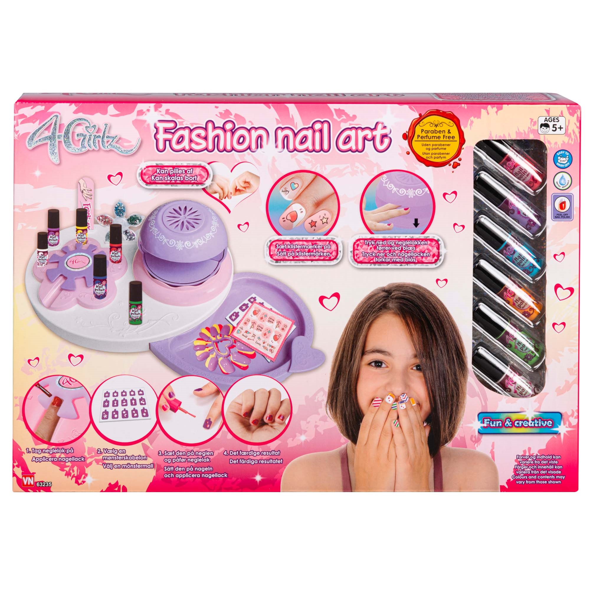 Forside » Legetøj » Rolle leg » Sminke Neglesæt til børn - Fashion nail art sæt HOME-TEX Skarp pris: 149,95DKK Gratis fragt på denne varePå lager Trustpilot Antal Læg i kurv Se mere fra: HOME-TEX Artikelnummer: LEG-VN63235 Har du spørgsmål til produktet? Type: Sminke Brand: 4 Girlz Farve: Multi Materiale: Plastik Anbefalet alder: +5 år Batteri: Ja, kræver 2xAA batterier - medfølger ikke Certificering: Produktet er CE-mærket efter danske standarder. Din garanti for, at legetøjet lever op til gældende krav for sikkerhed og er egnet til børn. Fashion nail art sæt. Neglesalon med batteridrevet neglelaktørrer, 6 neglelakker, neglefil, mønsterskabeloner, klistermærker, beholder med negledeko, kunstige negle og arbejdsbakke. Ekskl. 2 stk. AA-batterier. Tilbage til Sminke