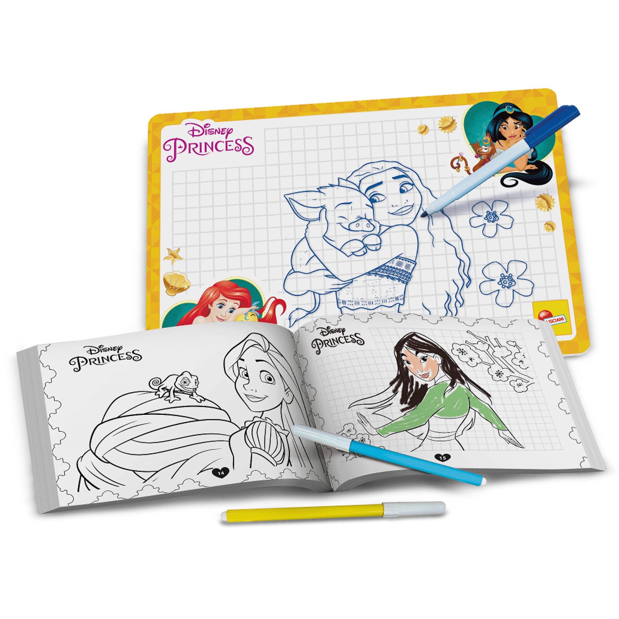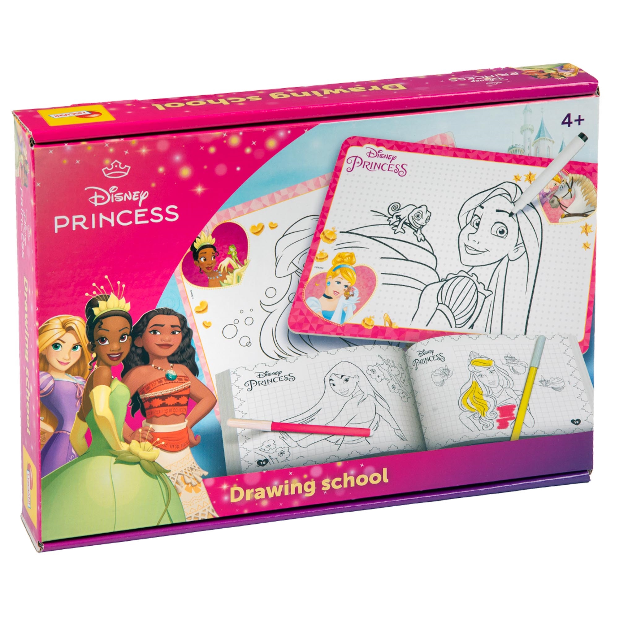 Princess tegneskole. Tegn og farvelæg dine Princess yndlingsfigurer. Sæt med 2 dobbeltsidede tavler, som du kan skrive og tegne på med tusch der kan viskes ud. Inkl. 2 tusser, pen der kan viskes ud og guidebog med kreative aktiviteter i stigende sværhedsgrad, som du kan kopiere på tavlerne med pennen der kan viskes ud. Du kan også farvelægge bogen med de medfølgende penne