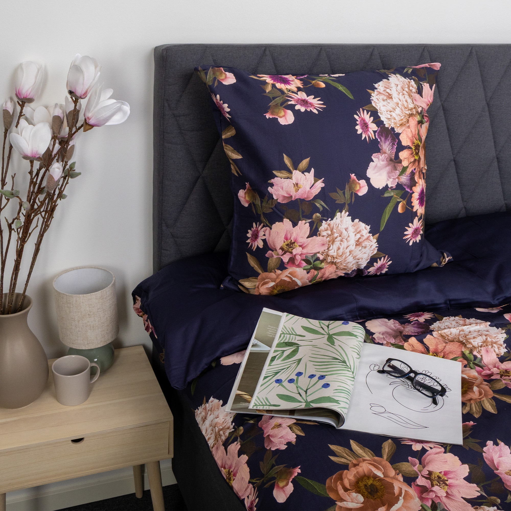 Har du ekstra puder i sengen, kan du nemt supplere med et ekstra pudebetræk i samme høje kvalitet. Det giver et ensartet og elegant udtryk i soveværelset, samtidig med at puderne får samme komfort og finish. Pudebetrækket kombinerer et smukt blomsterprint i mørkeblåt på den ene side med en rolig, ensfarvet bagside, så du nemt kan skifte udtryk alt efter stemning og indretning.