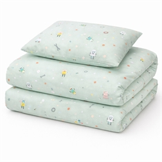 Sengesættet er fremstillet i 100% blød bomuld, som er åndbart og behageligt mod barnets hud. Bomuldens naturlige egenskaber hjælper med at regulere temperaturen i løbet af natten, så dit barn får en komfortabel og rolig søvn - året rundt.