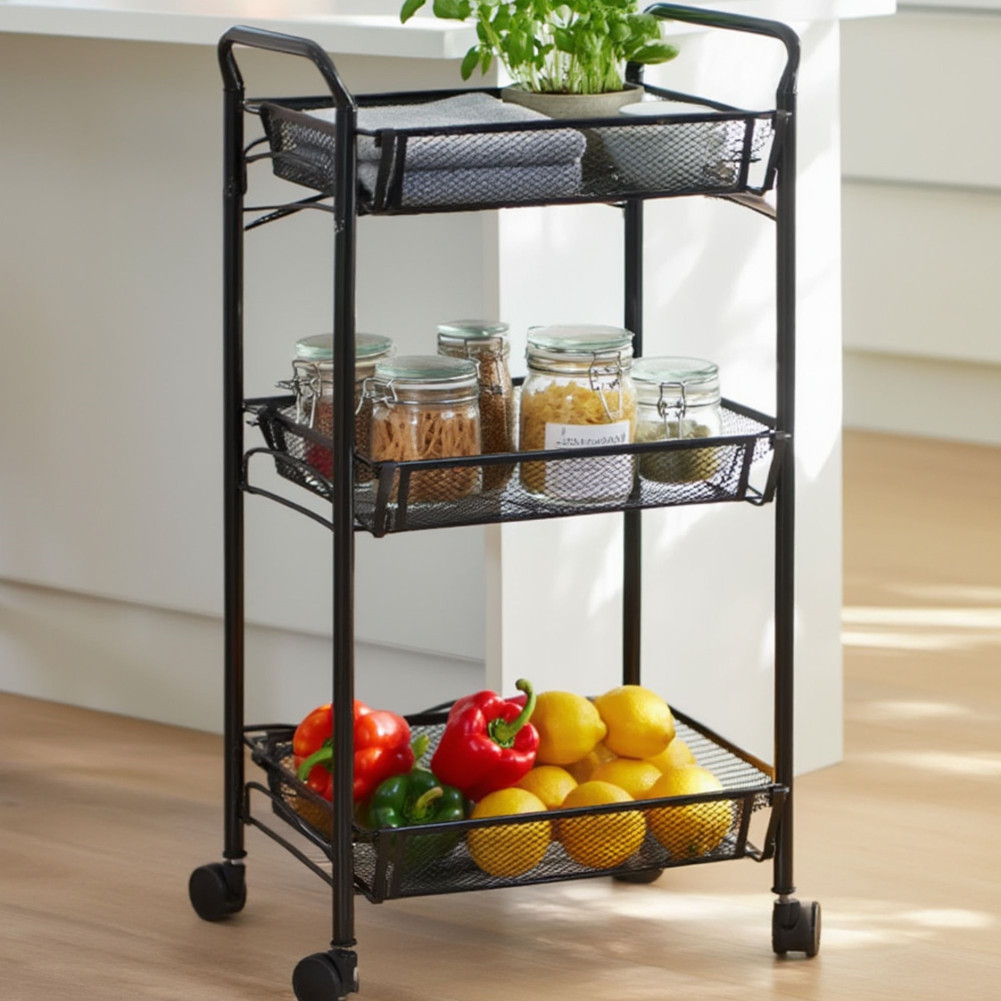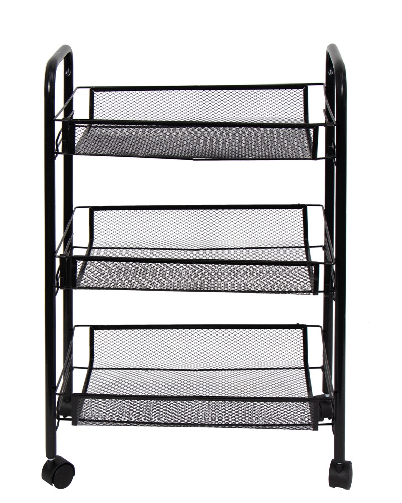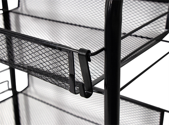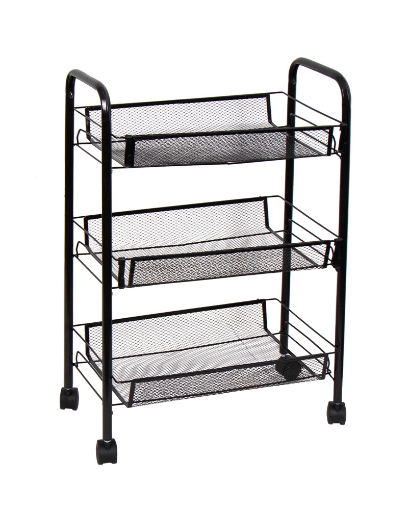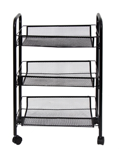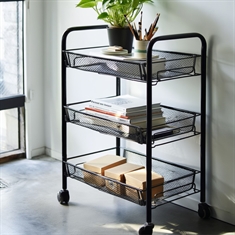 Denne opbevaringsvogn er både praktisk og stilfuldt designet. Den er lavet af robust sort metal og er udstyret med tre aftagelige kurve, der giver dig mulighed for at organisere dine ting på en nem og overskuelig måde. Vognen har også fire drejelige plastikhjul, der gør det nemt at flytte den rundt efter behov. To af hjulene har en låsefunktion, der sikrer, at vognen står stabilt, når den er parkeret.