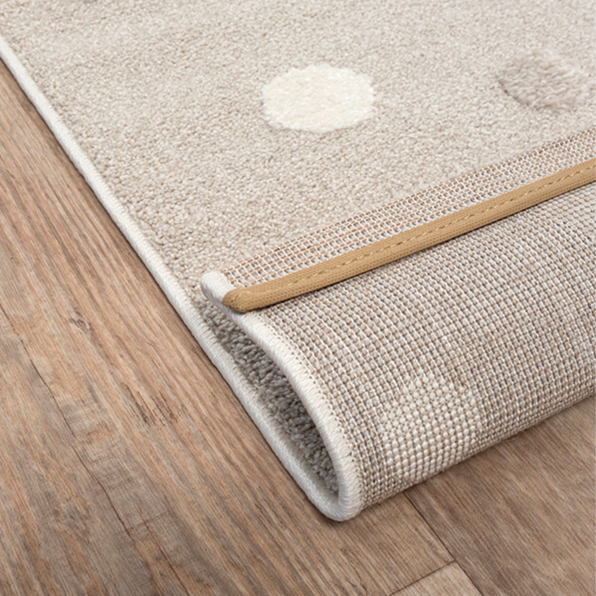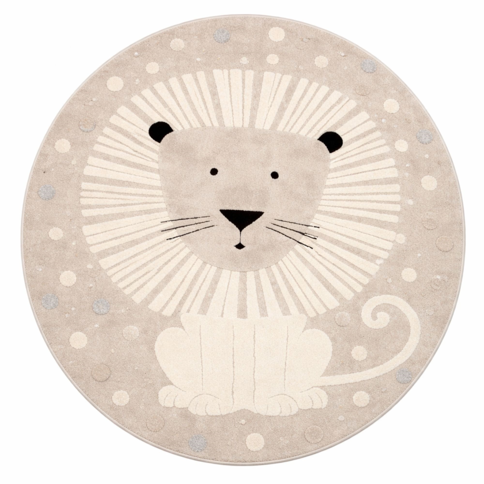 Sødt beige gulvtæppe med løvemotiv fra Elio Kids - det perfekte valg til et hyggeligt og indbydende børneværelse. Det søde løvedesign skaber en legende stemning, samtidig med at den runde form på 120x120 cm giver et blødt i rummet. Tæppet passer ideelt som legetæppe midt på gulvet, ved sengen eller i et hyggeligt legehjørne. Kombinationen af 50% polyester (PES) og 50% polypropylen (PP) gør tæppet både slidstærkt og nemt at vedligeholde, hvilket er ideelt til et aktivt børneværelse.