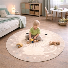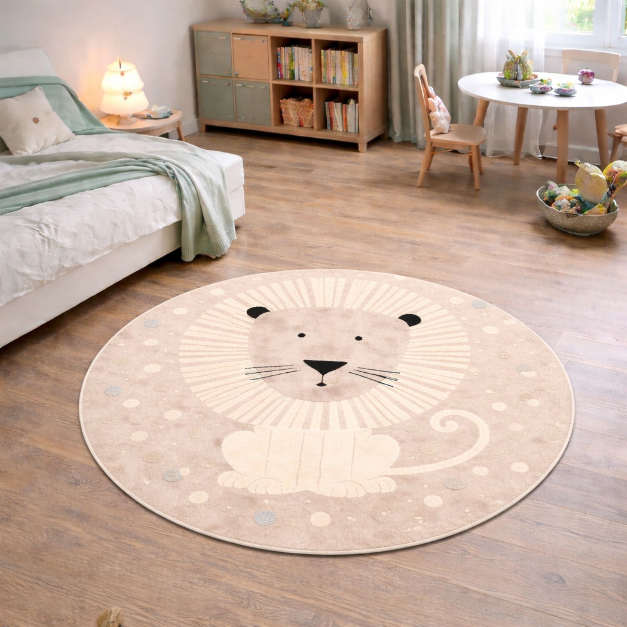 Et rundt løve gulvtæppe som dette er ikke kun en praktisk løsning – det er også en dekorativ detalje, der giver personlighed og varme til børneværelset.