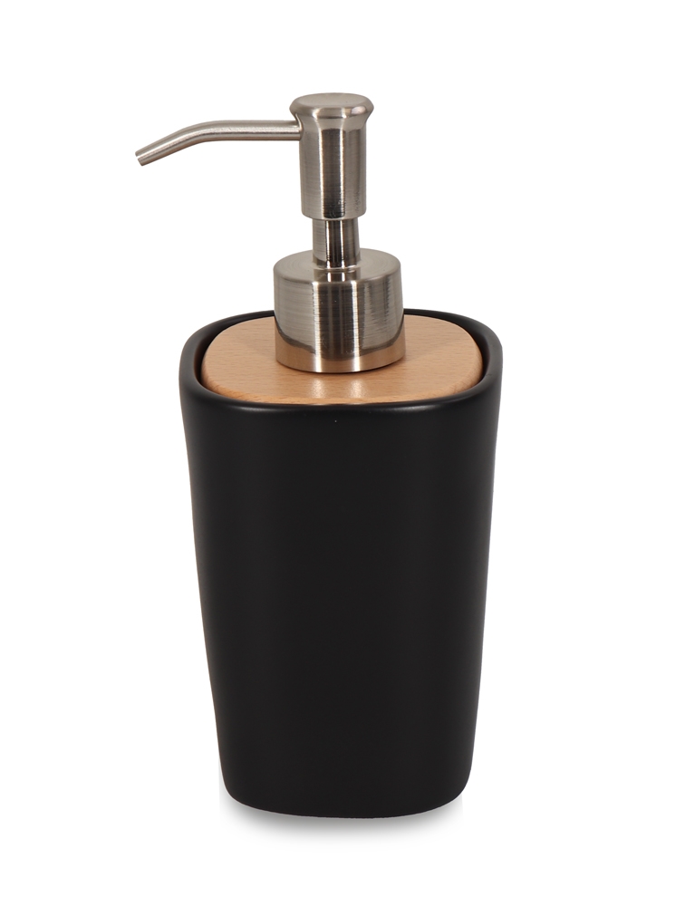 Sæbedispenseren “Urban Bad” er en elegant og praktisk løsning til badeværelse eller køkken — ideel til dig, der ønsker at kombinere hygiejne med stilren indretning. Dispenseren er designet med et enkelt, nordisk look, der passer harmonisk ind i moderne såvel som klassiske hjem, og dens neutrale sorte farve og træ top gør det let at matche med resten af indretningen.