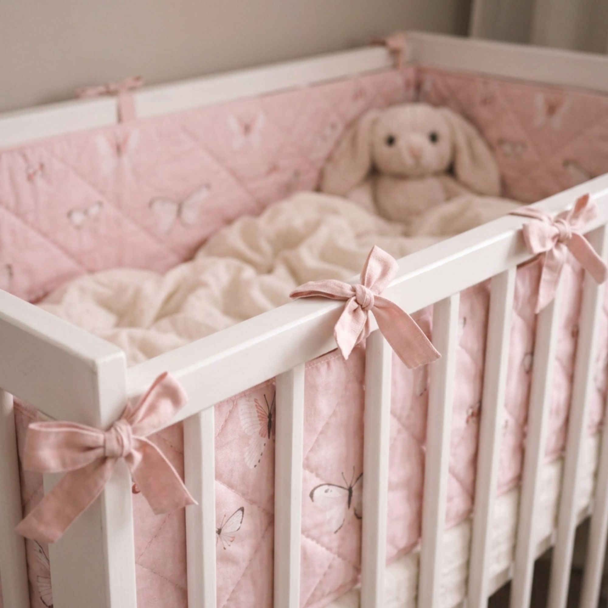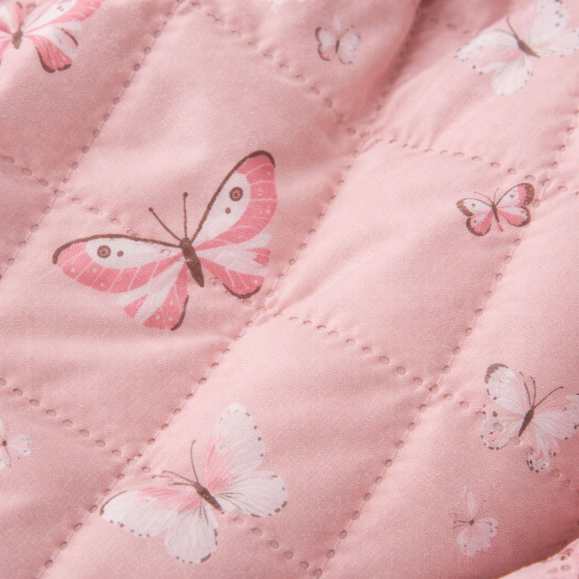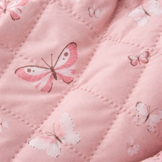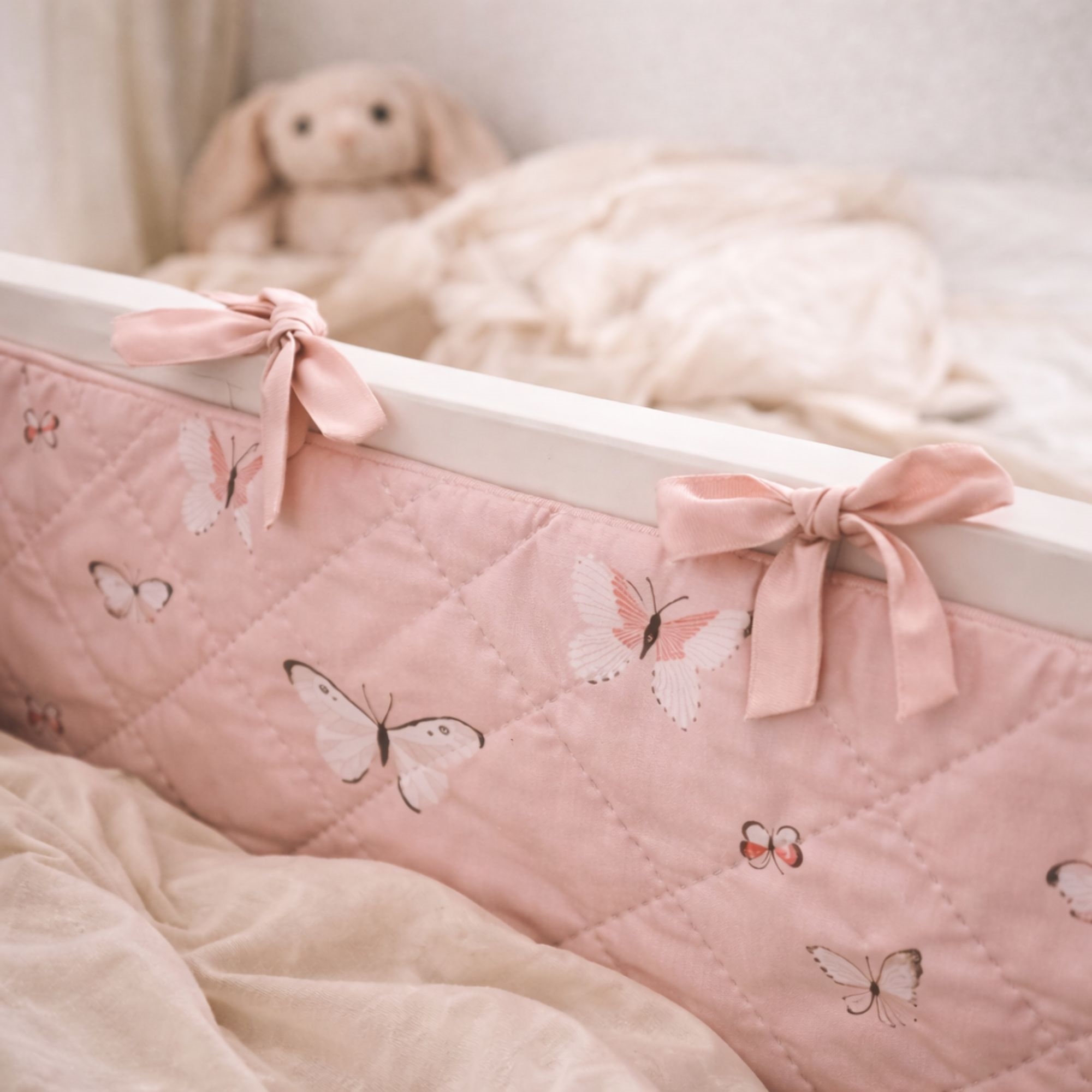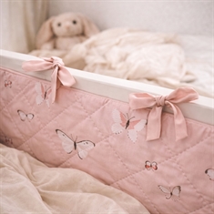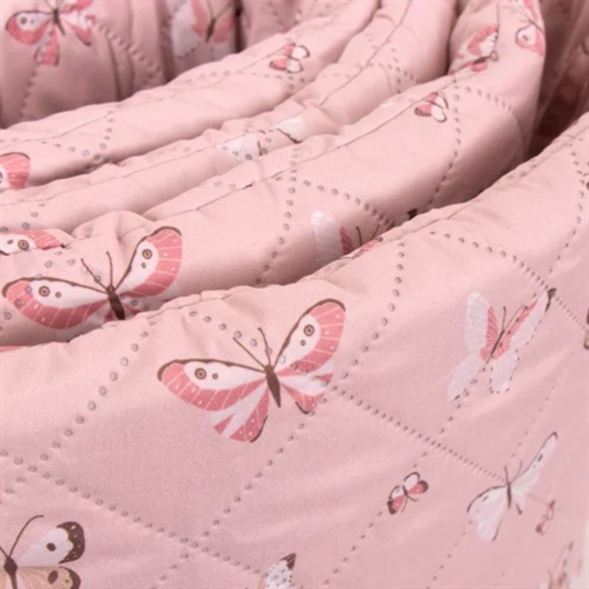 Det bløde betræk og det fine sommerfuglemotiv i lyserøde nuancer skaber et hyggeligt og børnevenligt udtryk i babysengen. Sengeranden fastgøres nemt med de påsyede bindebånd, så den bliver siddende sikkert på plads.