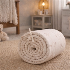Sengeranden måler 360x30 cm og passer til standard tremmesenge. Med en tykkelse på 2 cm giver den en behagelig polstring mod sengens kanter, samtidig med at den bevarer en let og fleksibel form.