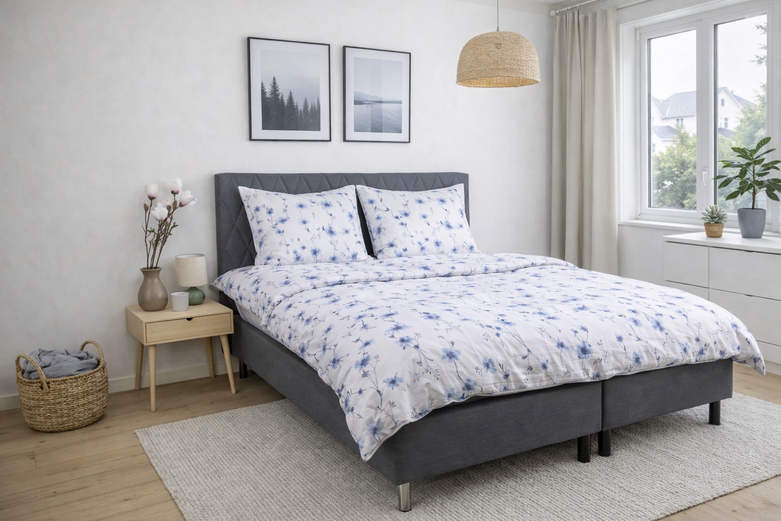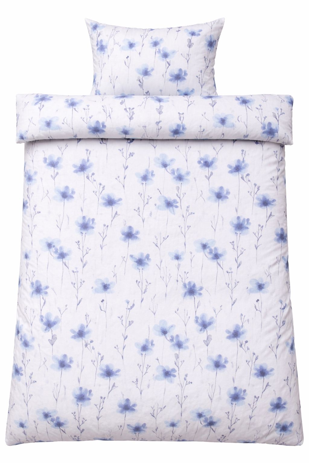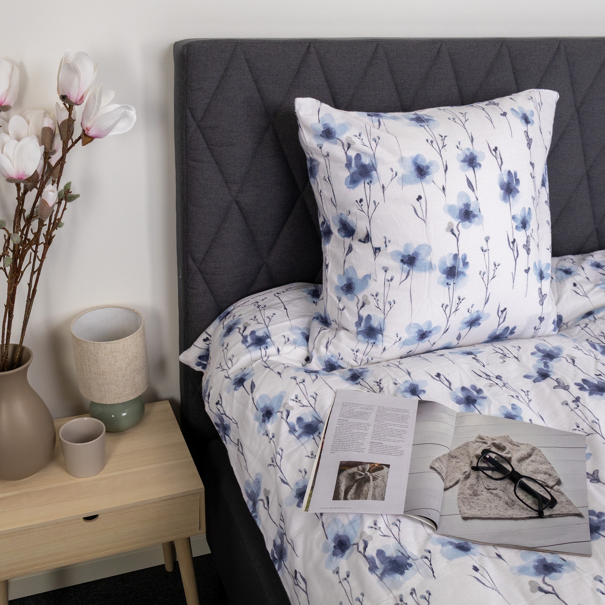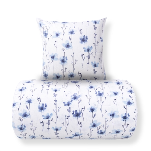 Det blomstrede design kombinerer flotte blå blomster med en lys baggrund, hvilket skaber et roligt og harmonisk udtryk i soveværelset. Et blomstret sengetøj, der både føles lunt og ser elegant ud.