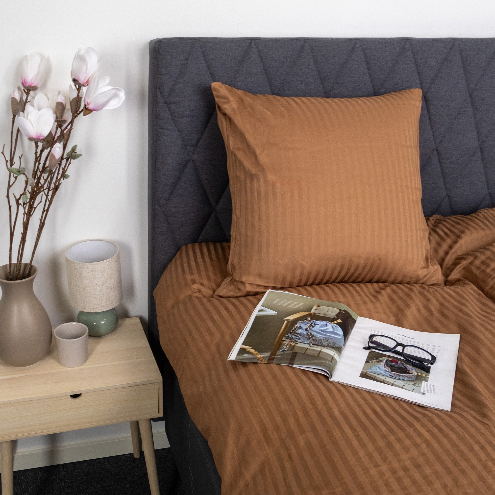 De jacquardvævede striber er vævet direkte ind i stoffet og skaber et diskret spil mellem matte og blanke flader. Denne væveteknik giver sengetøjet struktur og dybde uden brug af print og sikrer, at mønsteret forbliver flot og ensartet, selv efter gentagen vask. Det ensfarvede design gør det nemt at få sengesættet til at passe ind i alle former for indretning.
