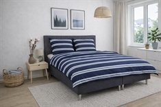 Det stribet design kombinerer flotte blå og hvide striber med en mørkeblå baggrund, hvilket skaber et roligt og harmonisk udtryk i soveværelset. Et stribet sengetøj, der både føles lunt og ser elegant ud.