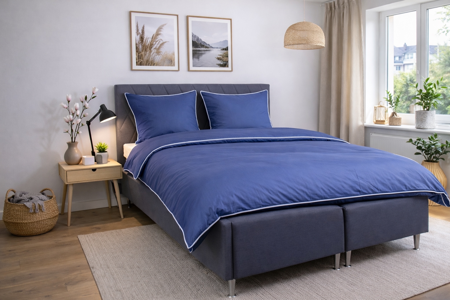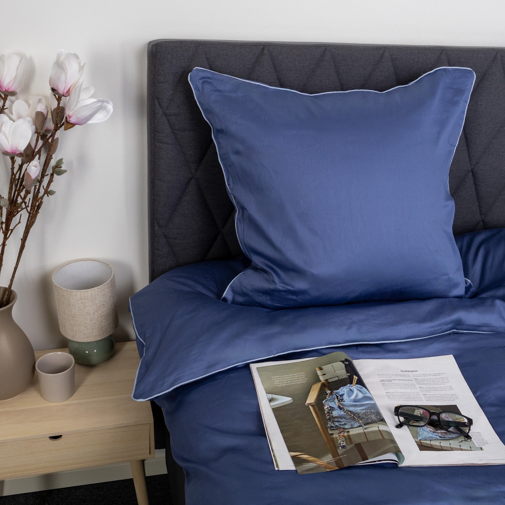 Skab et elegant og luksuriøst udtryk i soveværelset med dette eksklusive sengesæt i 100% bomuldssatin med dekorativ pipingkant fra By Borg. Det ensfarvede design i dyb blå kombineret med en lysere pipingkant tilfører et stilrent og sofistikeret look, der løfter helhedsindtrykket i soveværelset.
