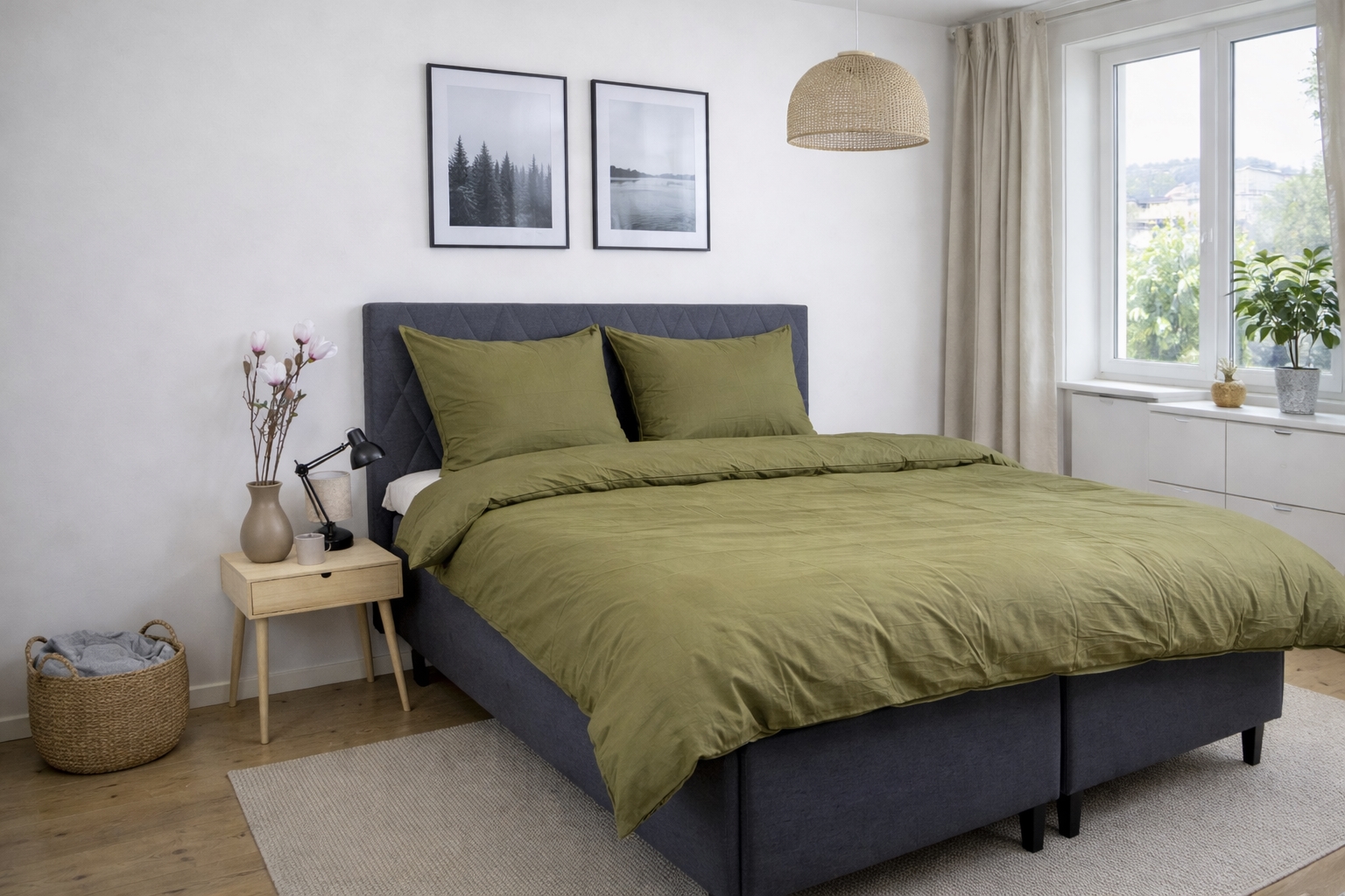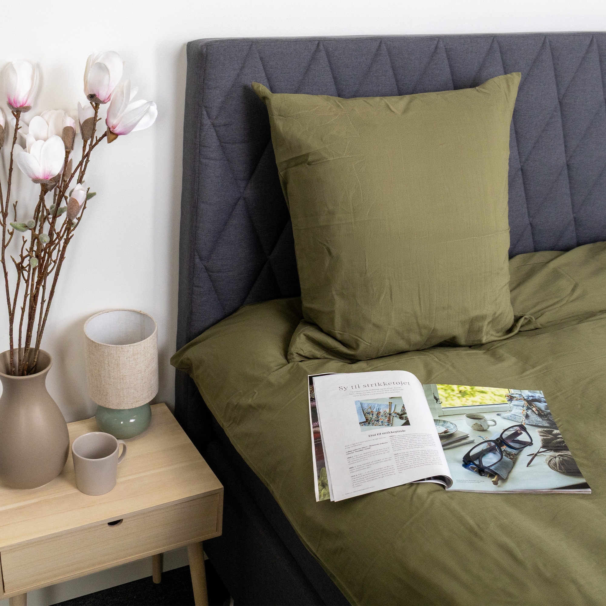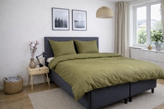 Dyne- og pudebetræk er lukkes med indvendig skjult lynlås, som giver et stilrent udtryk og gør det nemt at skifte sengetøj. Den grønne nuance og det ensfarvede design gør sengesættet let at kombinere med både lyse og mørke elementer i soveværelset.