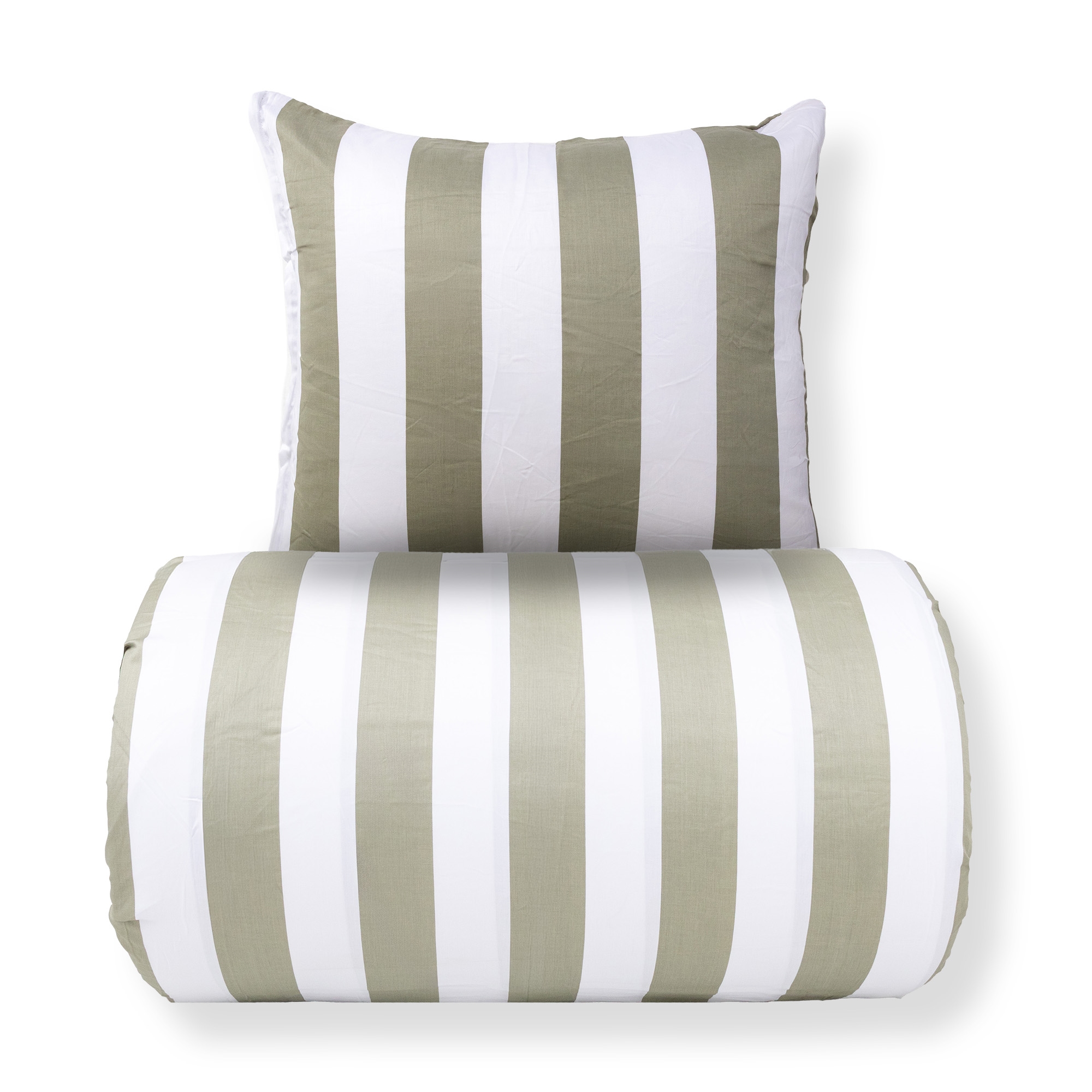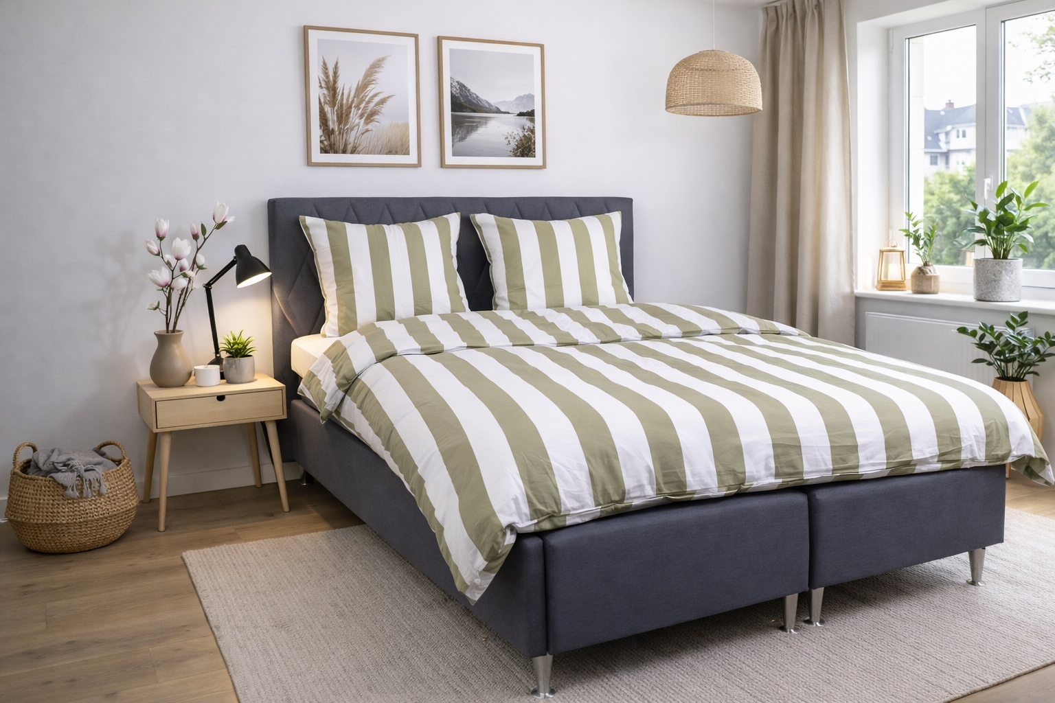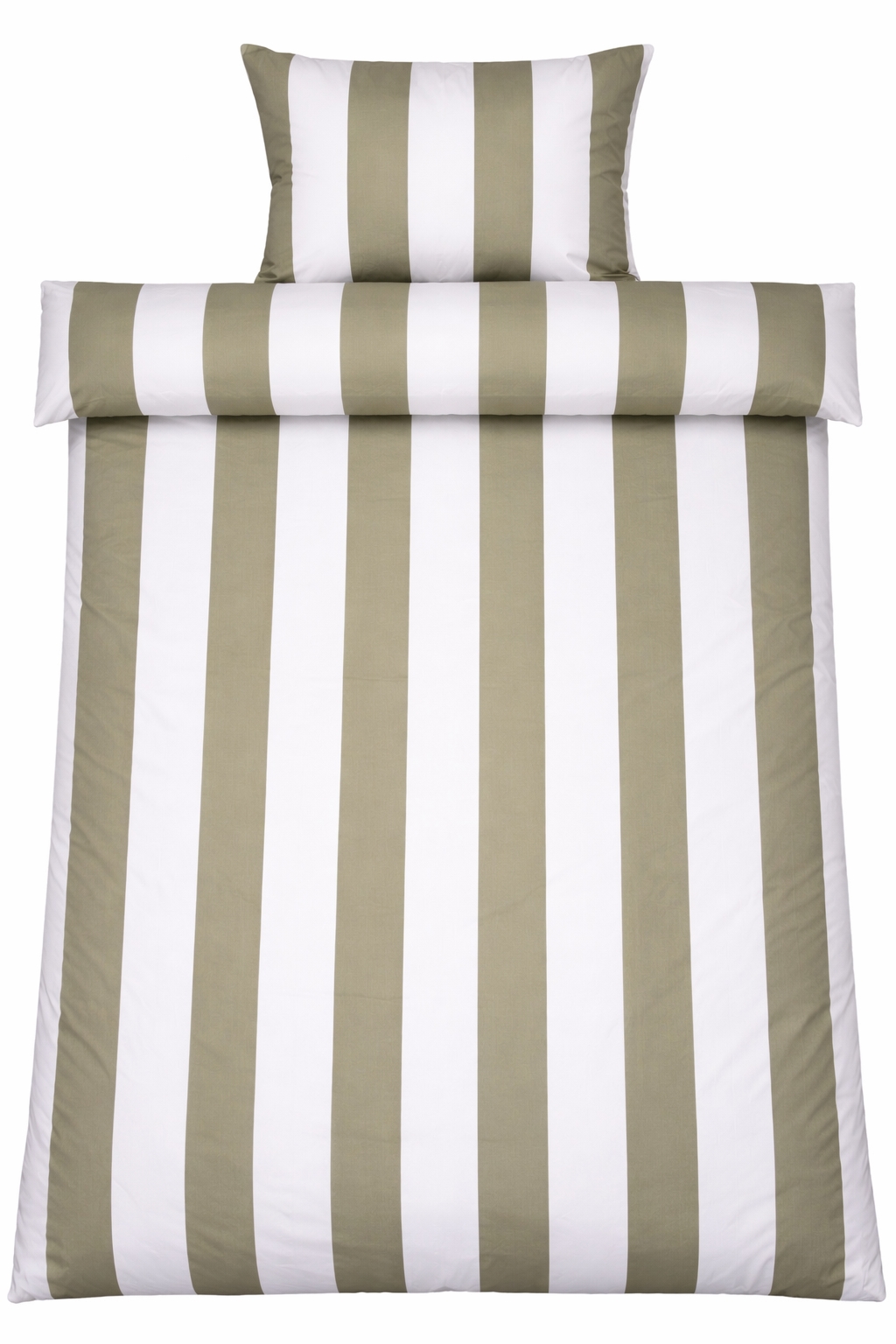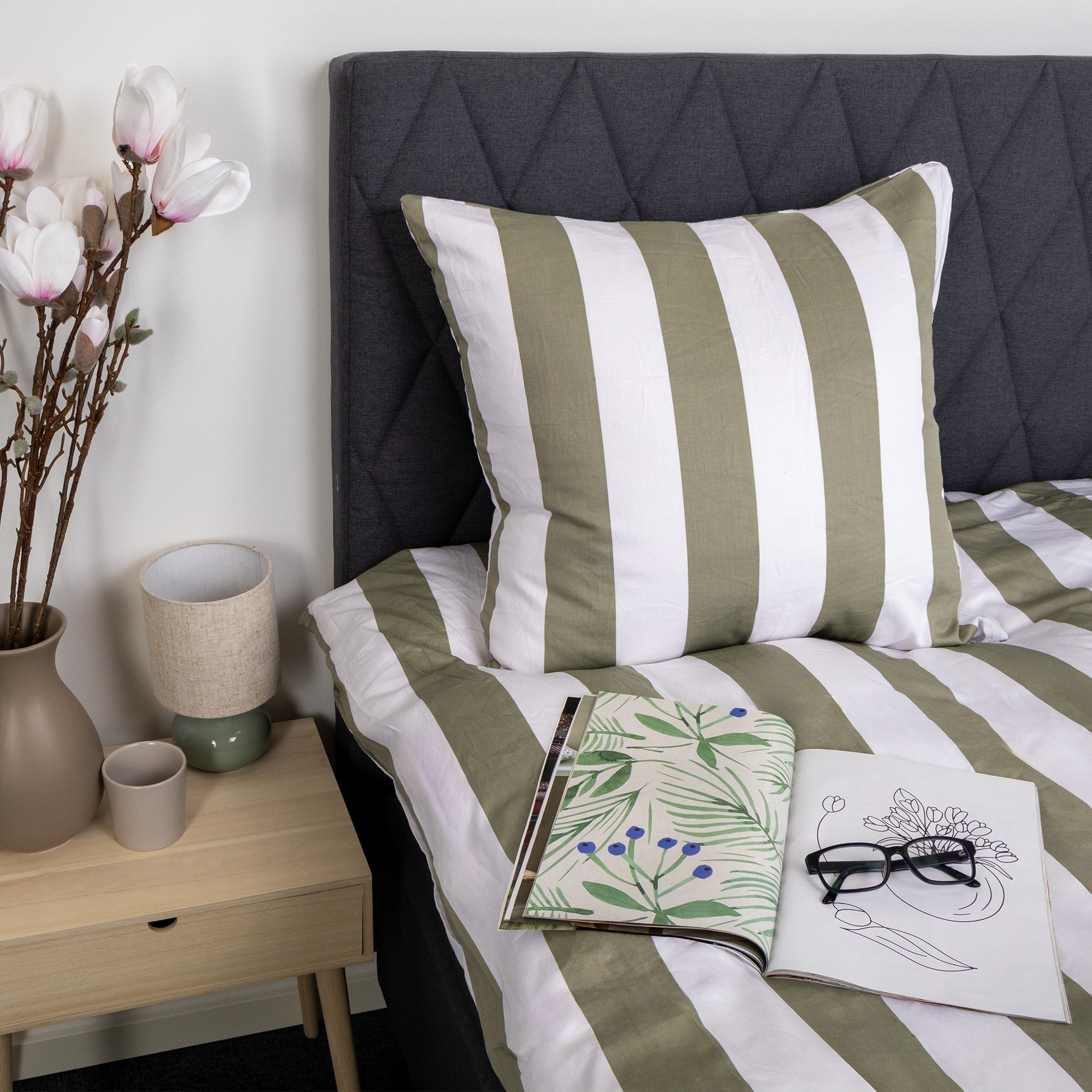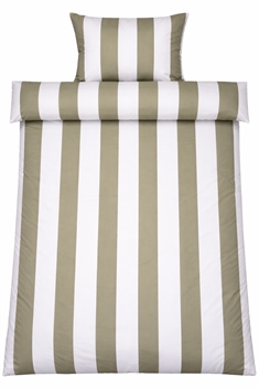 Det brede stribede print giver et skarpt og harmonisk udtryk. Kombinationen af olivengrønne og hvide striber giver soveværelset et afslappet og roligt udtryk, samtidig med at designet er let at kombinere med forskellige puder.