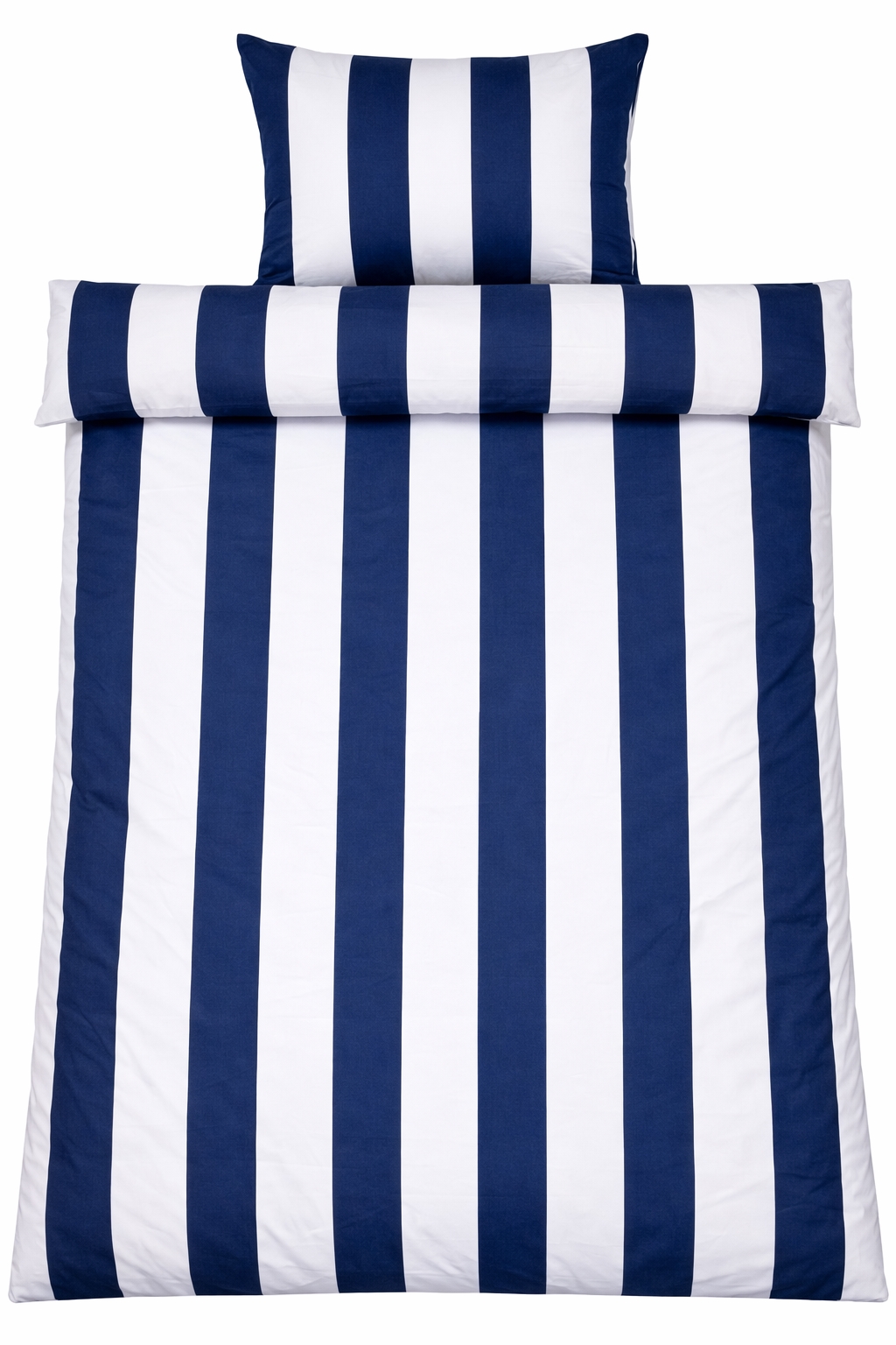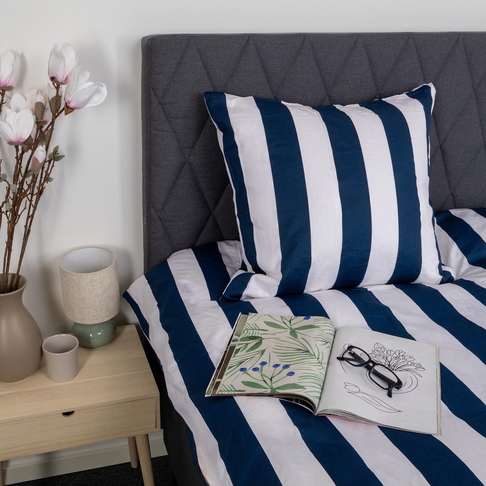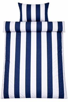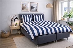 Det brede stribede print giver et skarpt og harmonisk udtryk. Kombinationen af blå og hvide striber giver soveværelset et afslappet og roligt udtryk, samtidig med at designet er let at kombinere med forskellige puder.