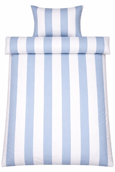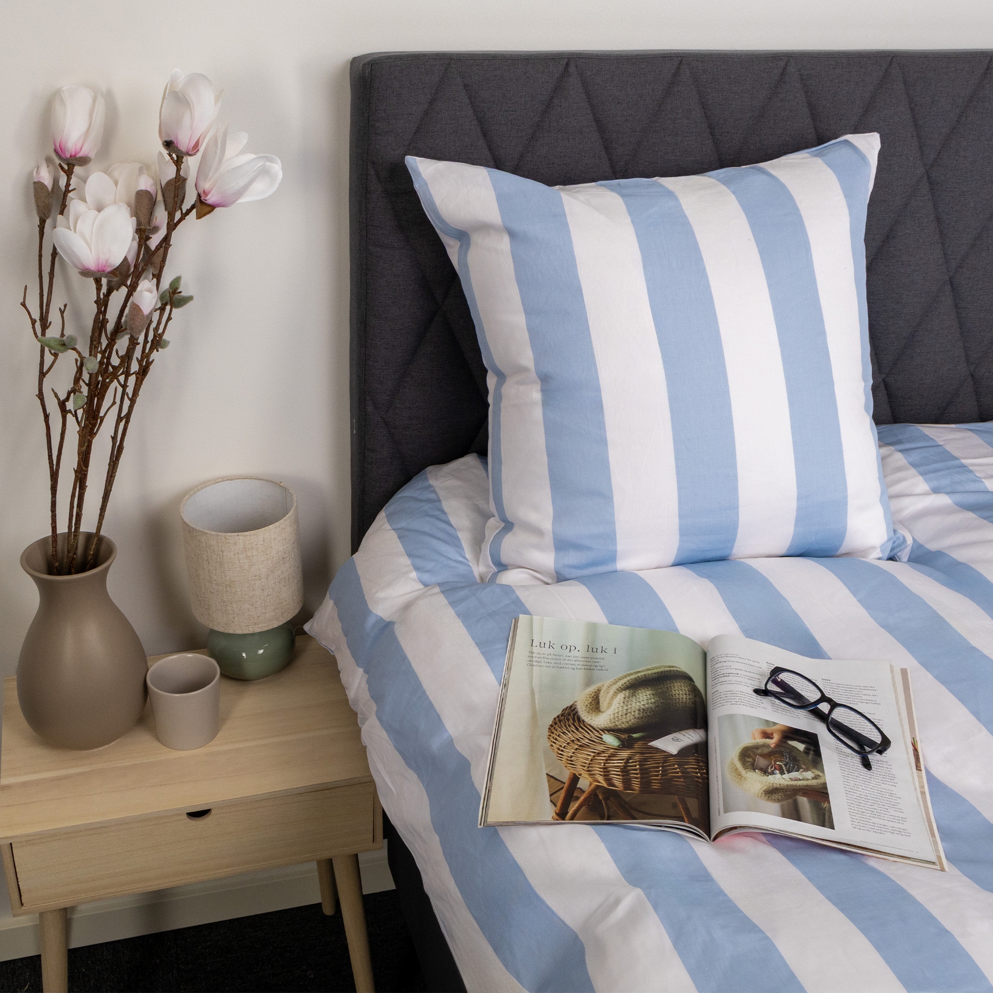 Det brede stribede print giver et skarpt og harmonisk udtryk. Kombinationen af lyseblå og hvide striber giver soveværelset et afslappet og roligt udtryk, samtidig med at designet er let at kombinere med forskellige puder.