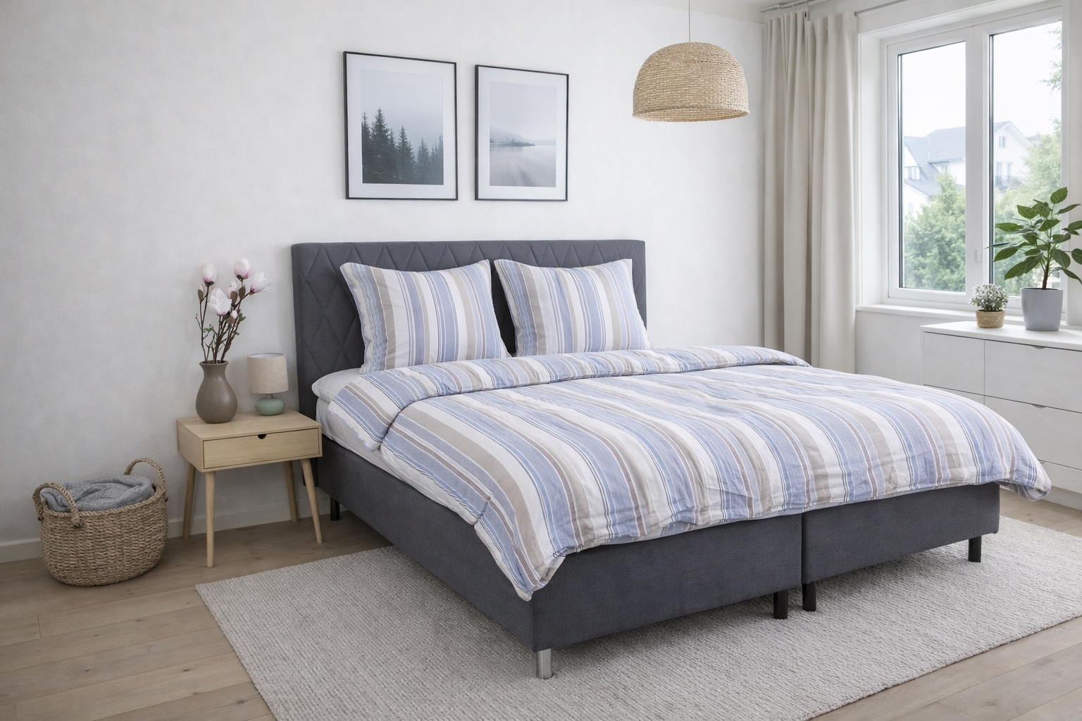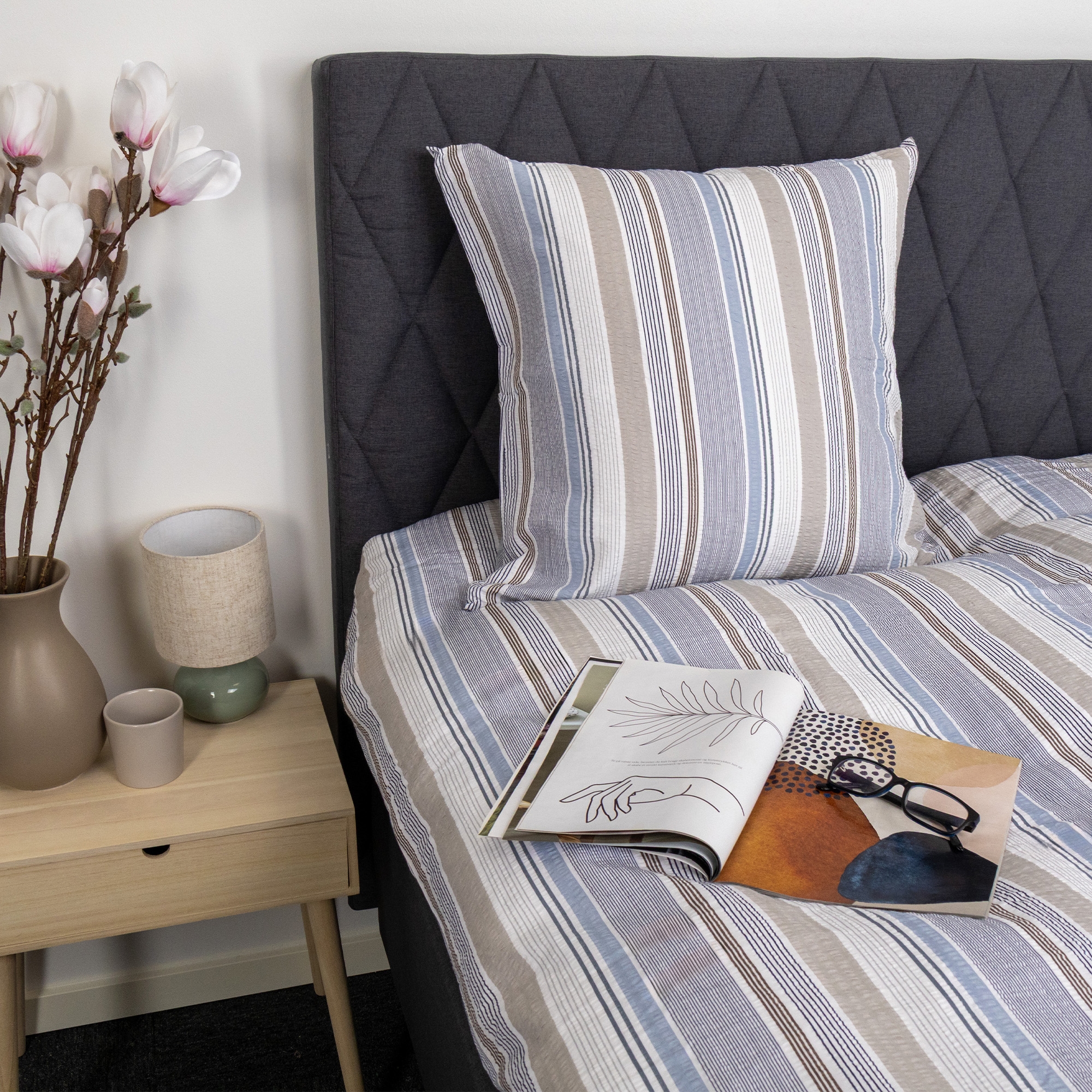 Dyne- og pudebetræk lukkes med lynlås, som gør det nemt at skifte sengetøj og holder både dyne og pude sikkert på plads natten igennem. Det stribet design giver et roligt og tidløst udtryk, der passer godt ind i både moderne og klassiske soveværelser.