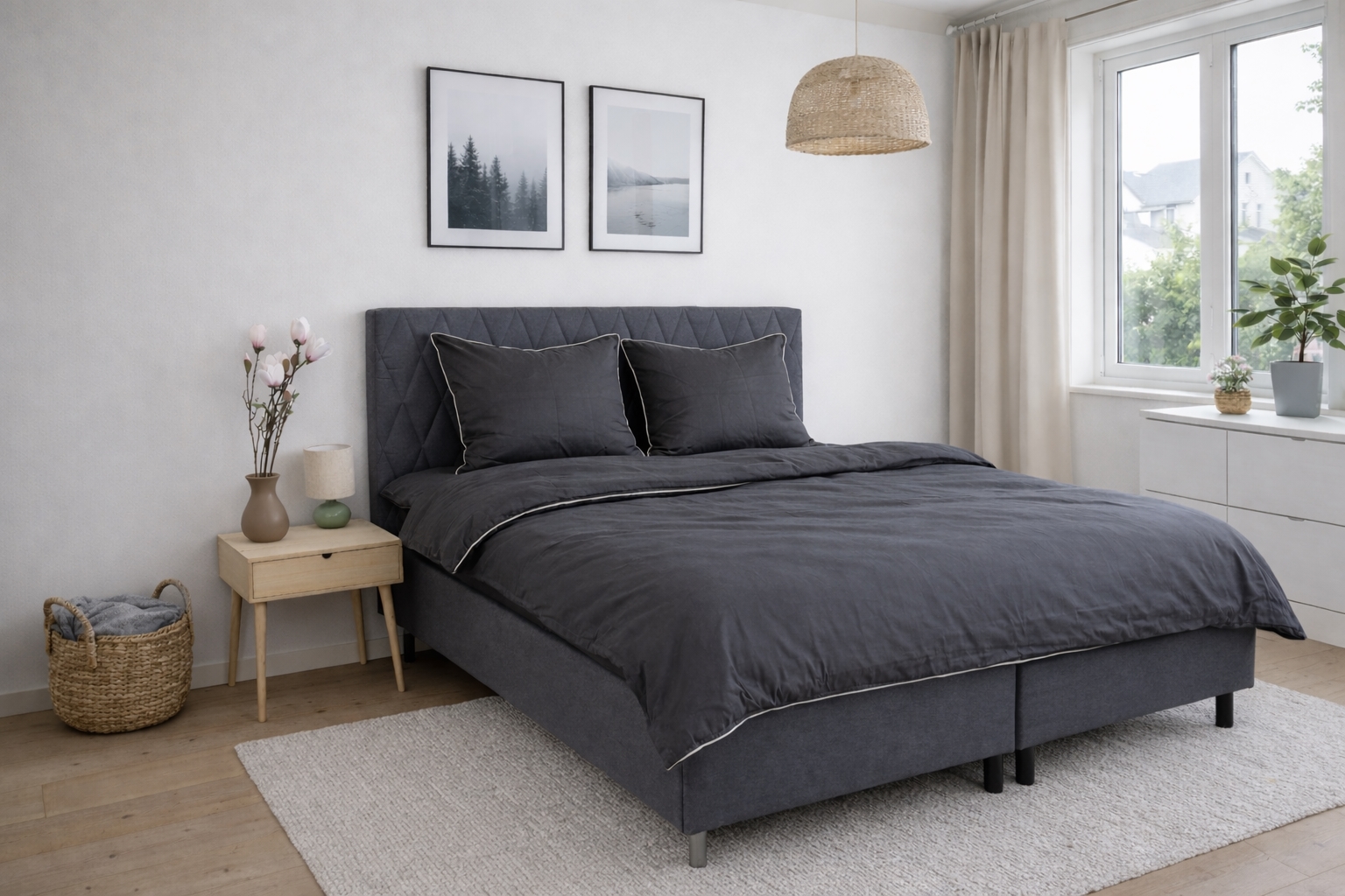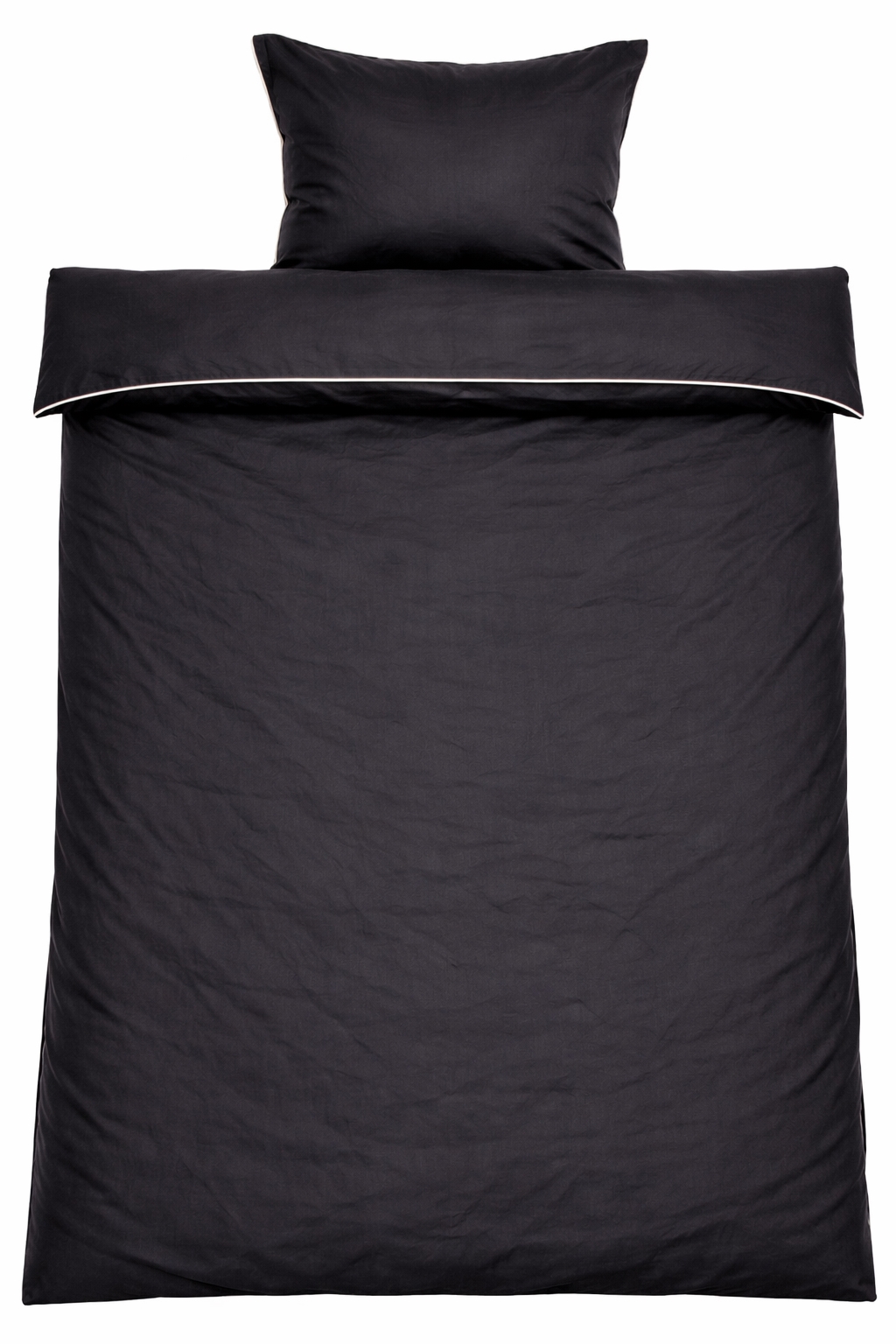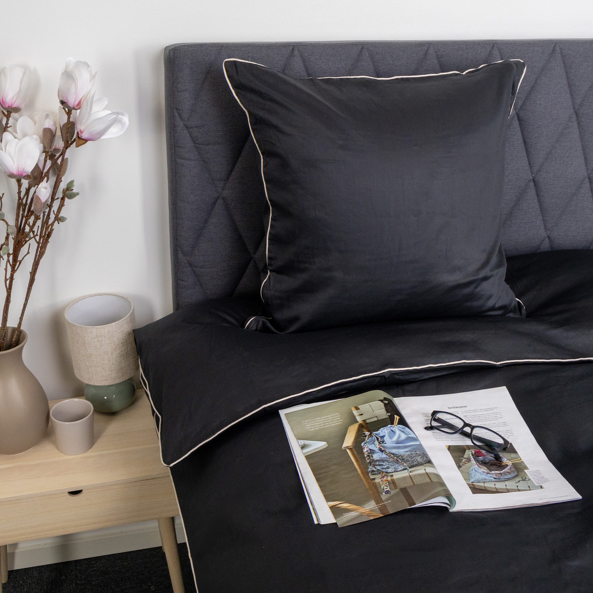 Skab et elegant og luksuriøst udtryk i soveværelset med dette eksklusive sengesæt i 100% bomuldssatin med dekorativ pipingkant fra By Borg. Det ensfarvede design i dyb sort kombineret med en hvid pipingkant tilfører et stilrent og sofistikeret look, der løfter helhedsindtrykket i soveværelset.