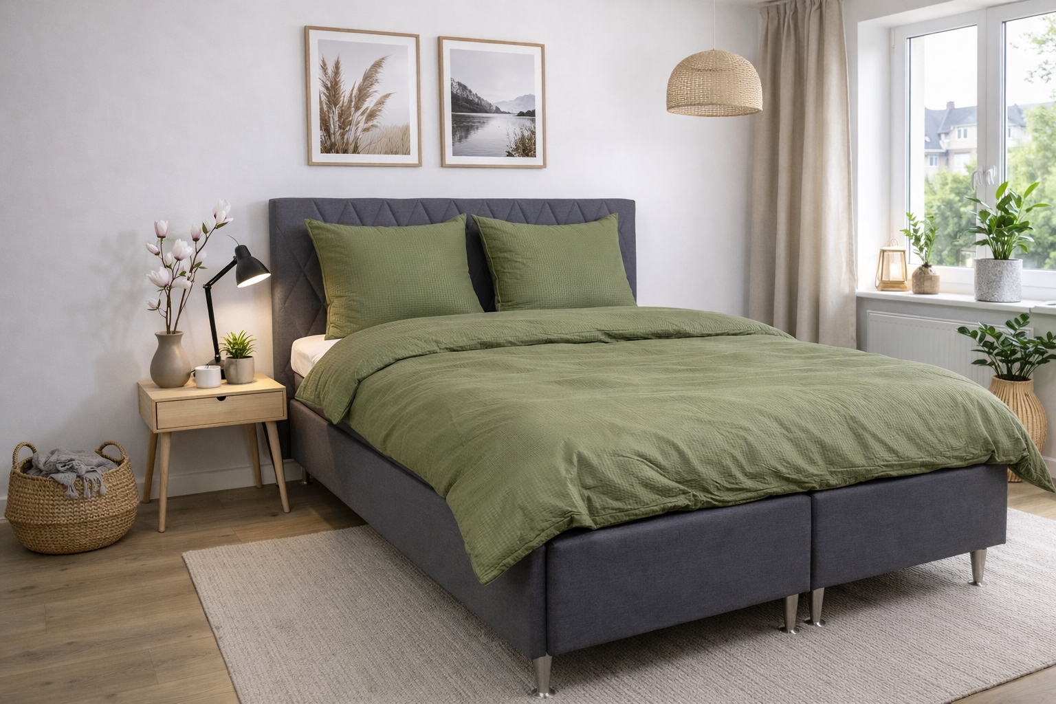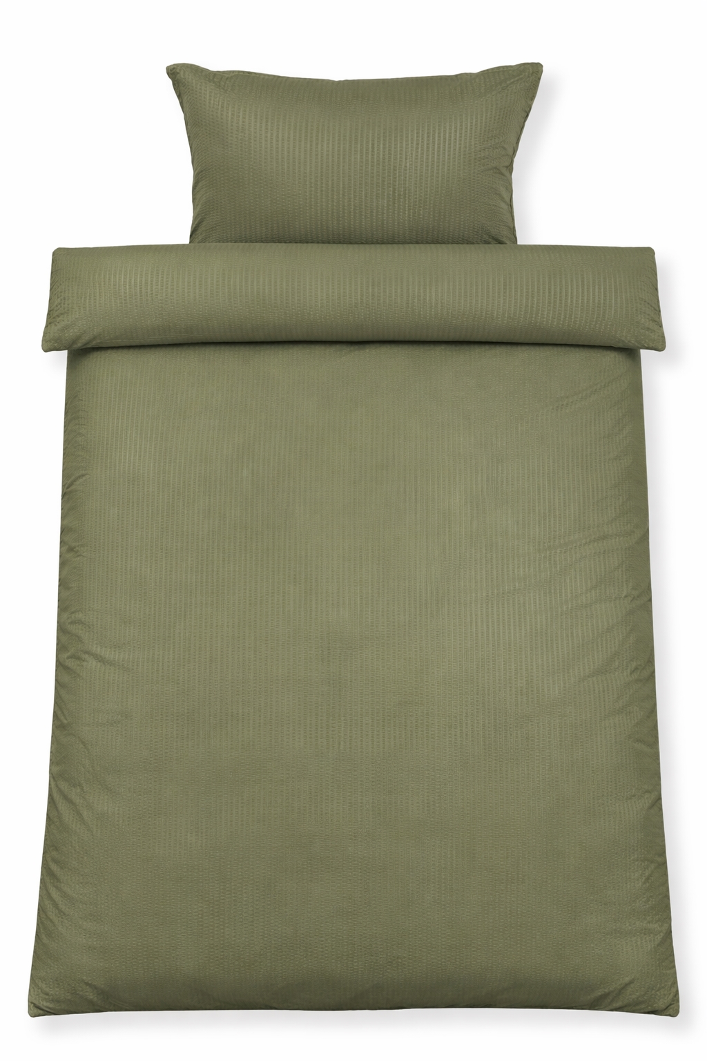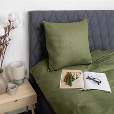 Det ensfarvede grønne sengetøj tilfører soveværelset ro og harmoni og er nem at kombinere med både neutrale og farverige lagner og puder.
