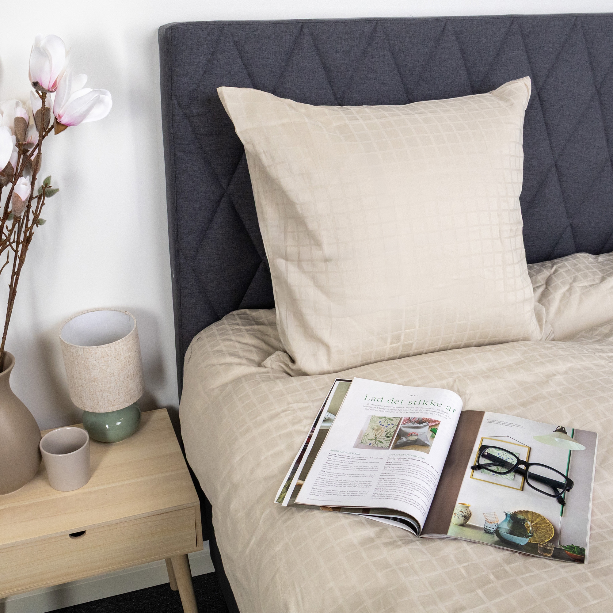 De sandfarvet firkanter giver et moderne og sofistikeret look, der passer perfekt ind i både minimalistiske og klassiske soveværelser. Dyne- og pudebetræk lukkes med skjult lynlås, som giver et pænt finish og holder dynen sikkert på plads.