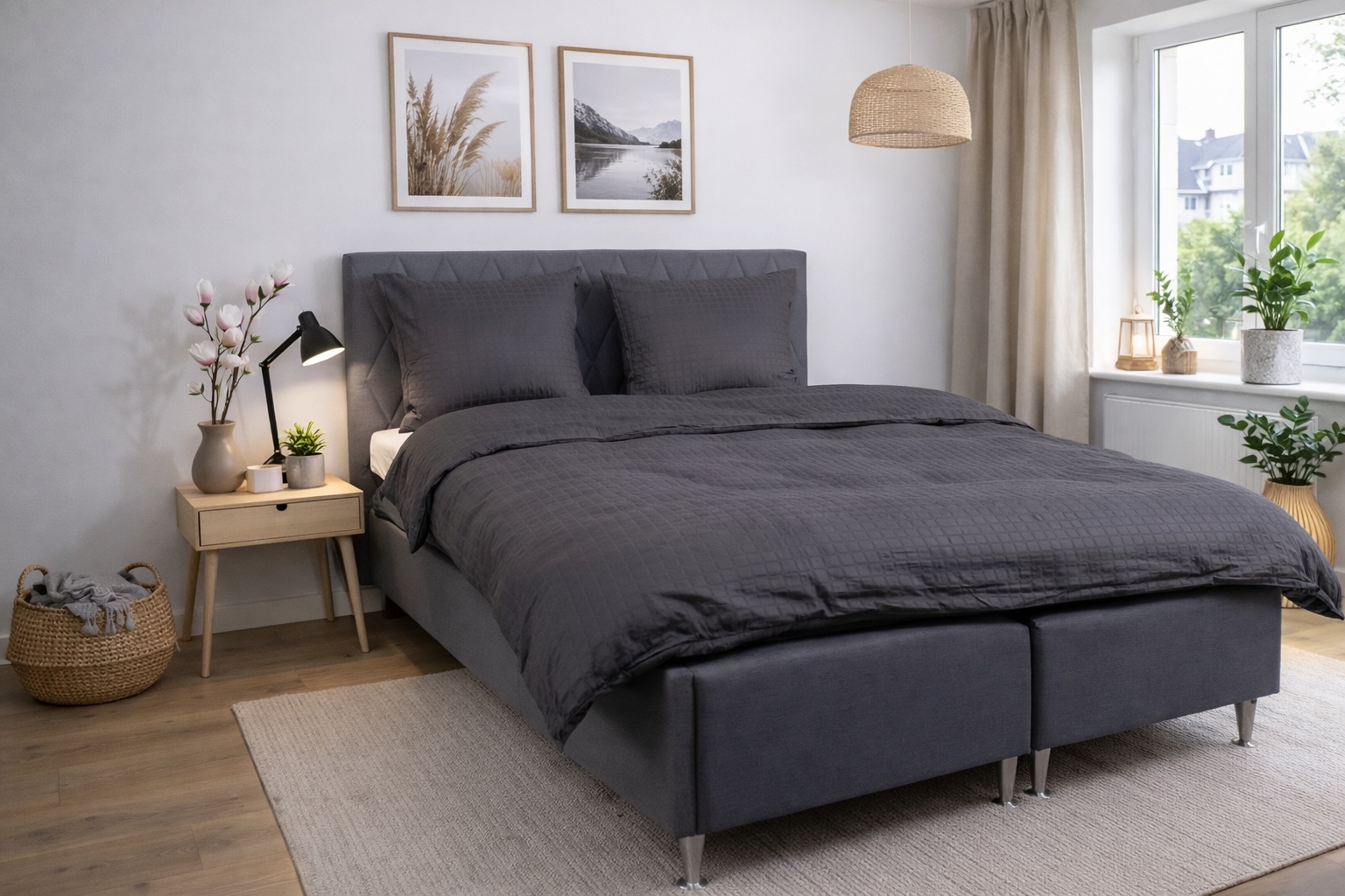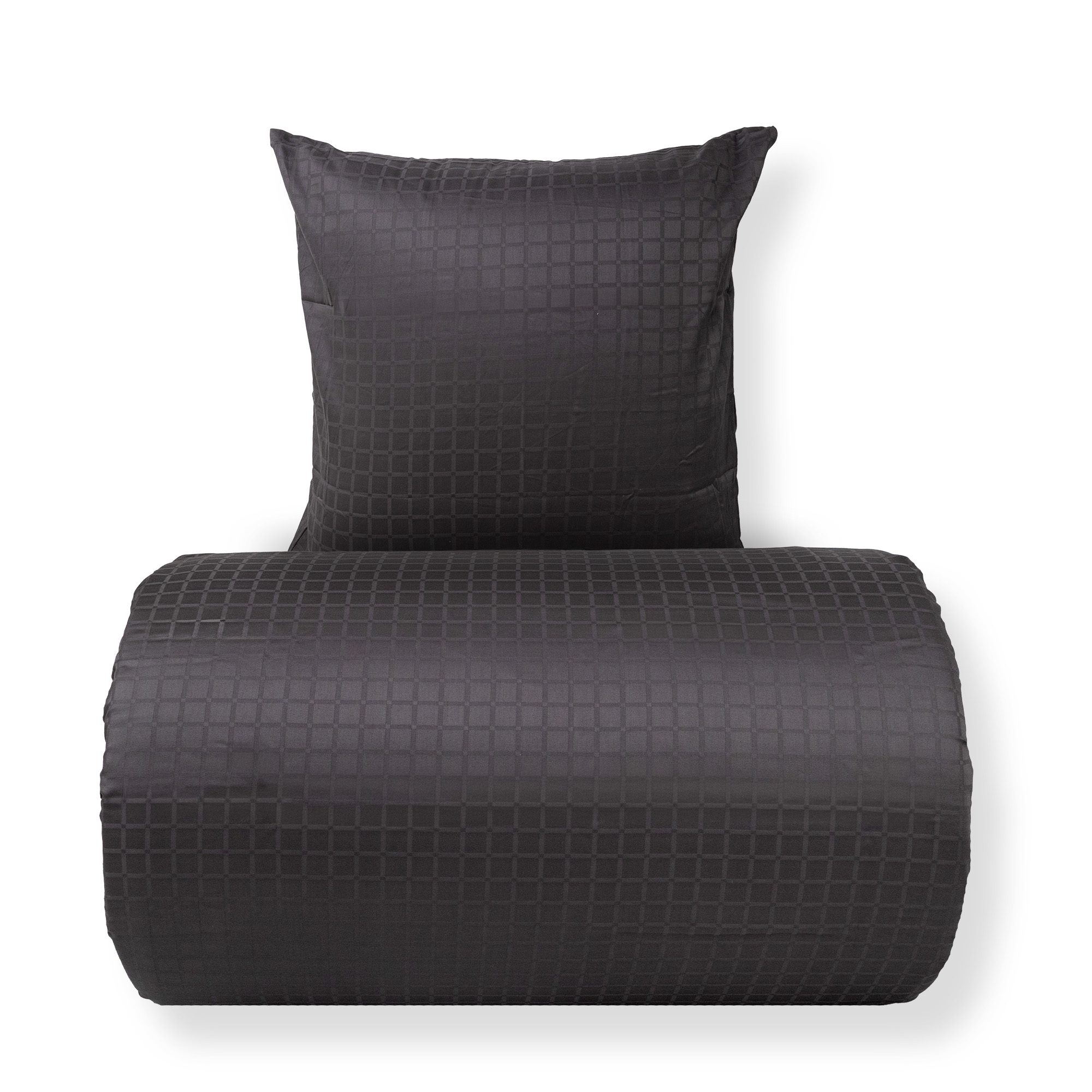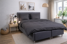 De mørkegrå firkanter giver et moderne og sofistikeret look, der passer perfekt ind i både minimalistiske og klassiske soveværelser. Dyne- og pudebetræk lukkes med skjult lynlås, som giver et pænt finish og holder dynen sikkert på plads.