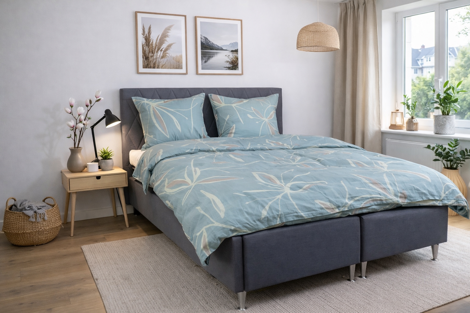 Bomuldssatin er et naturligt og åndbart materiale med gode fugtabsorberende egenskaber. Det hjælper med at regulere temperaturen og skaber et behageligt sovemiljø hele året rundt - uanset årstid.