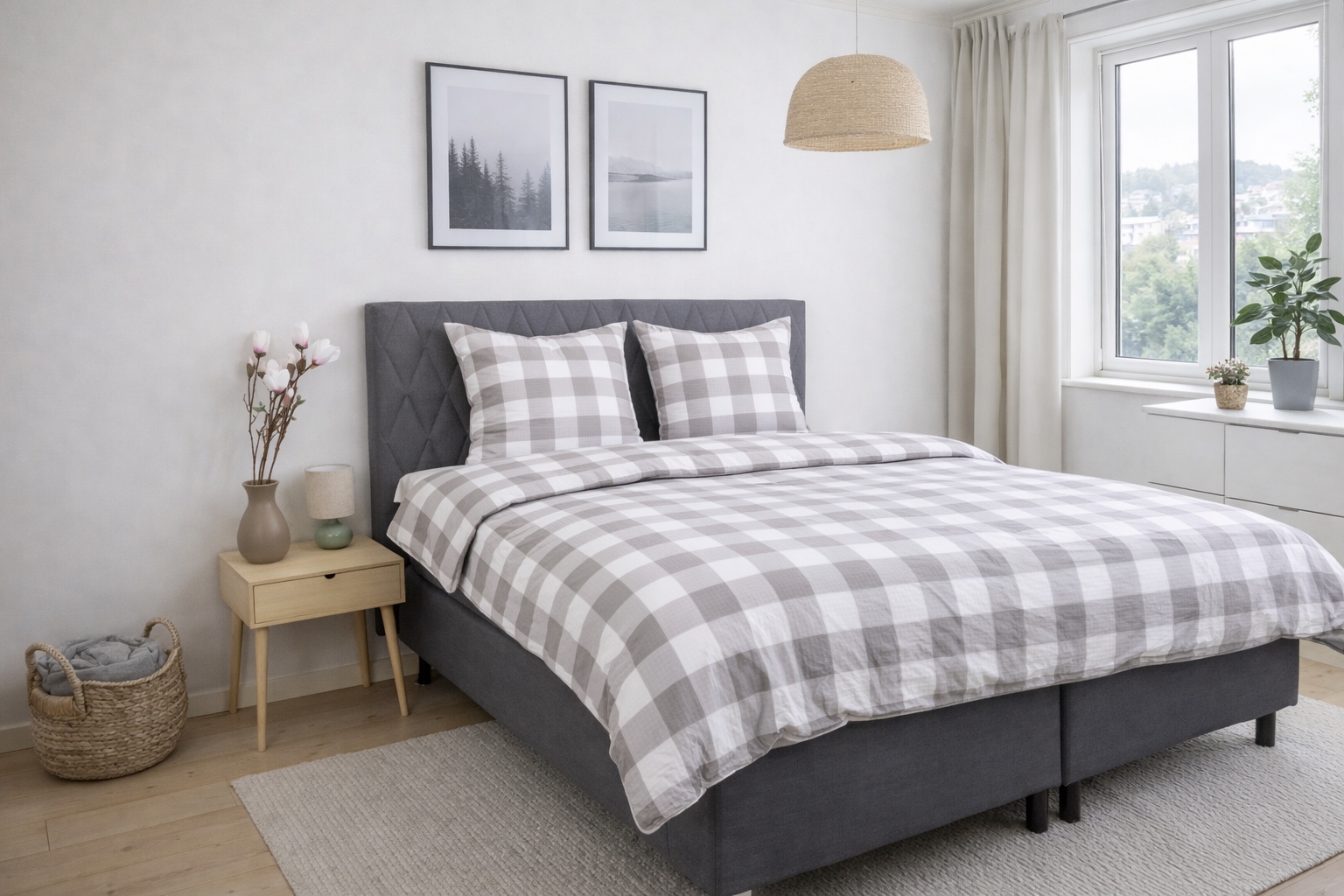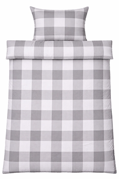 Dyne- og pudebetræk lukkes med lynlås, som gør det nemt at skifte sengetøj og holder både dyne og pude sikkert på plads natten igennem. Det ternede design i hvid og grå giver et roligt og tidløst udtryk, der passer godt ind i både moderne og klassiske soveværelser.