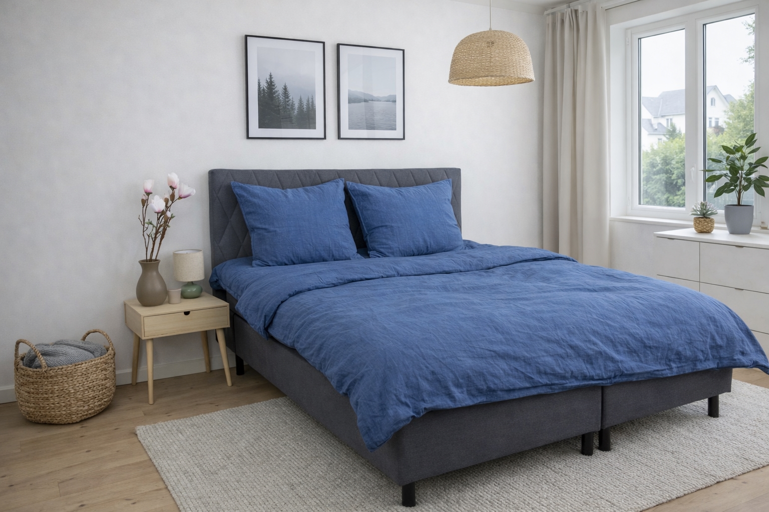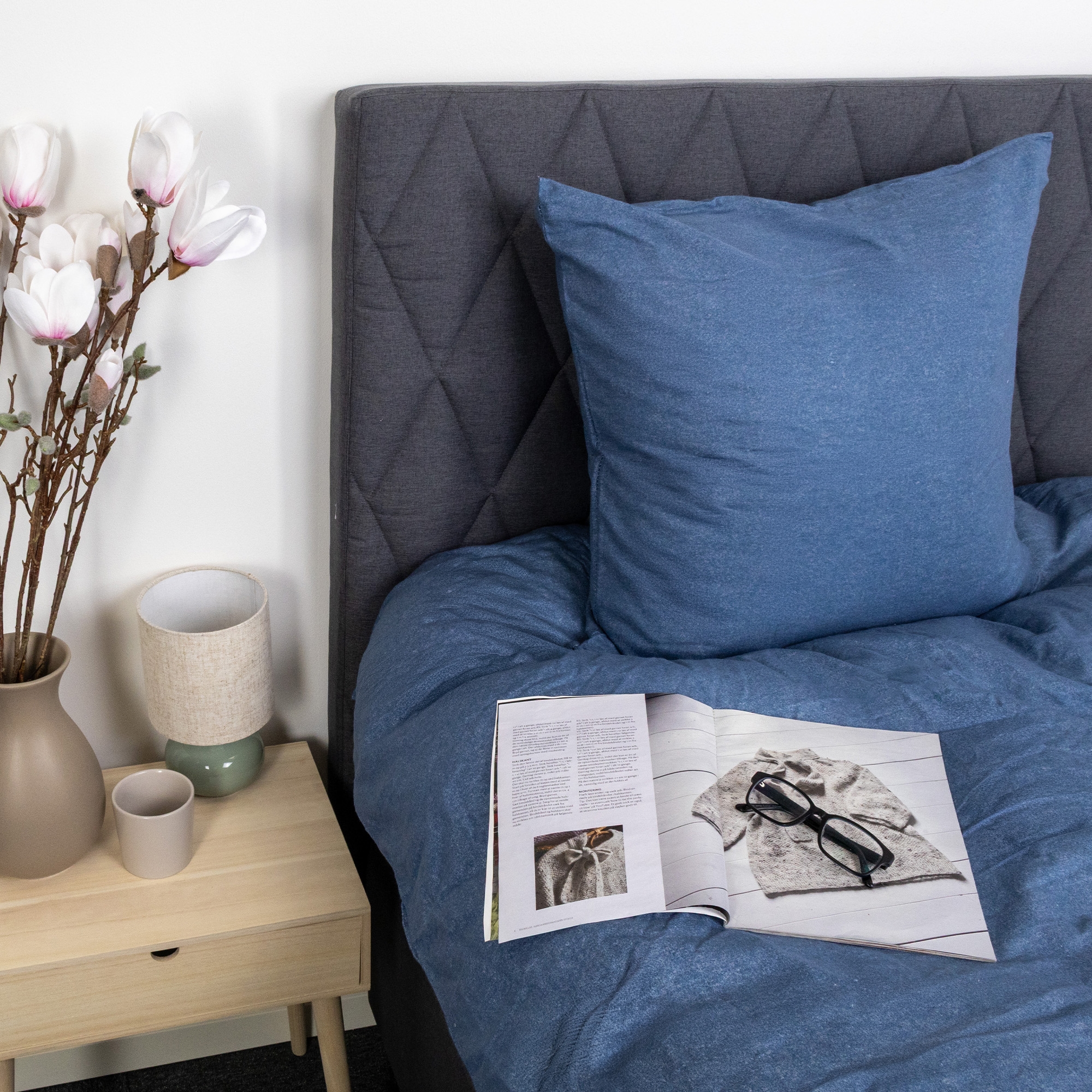 Dyne- og pudebetræk lukkes begge med indvendig lynlås, som gør det nemt at skifte sengetøj og sikrer, at dynen og puden bliver på plads hele natten. Den blå melerede farve skaber et roligt og naturligt udtryk, der passer godt ind i både moderne og klassiske soveværelser.