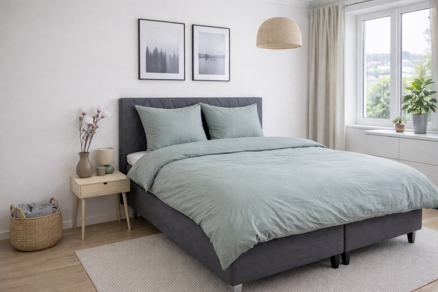 Dyne- og pudebetræk lukkes begge med indvendig lynlås, som gør det nemt at skifte sengetøj og sikrer, at dynen og puden bliver på plads hele natten. Den grønne melerede farve skaber et roligt og naturligt udtryk, der passer godt ind i både moderne og klassiske soveværelser.