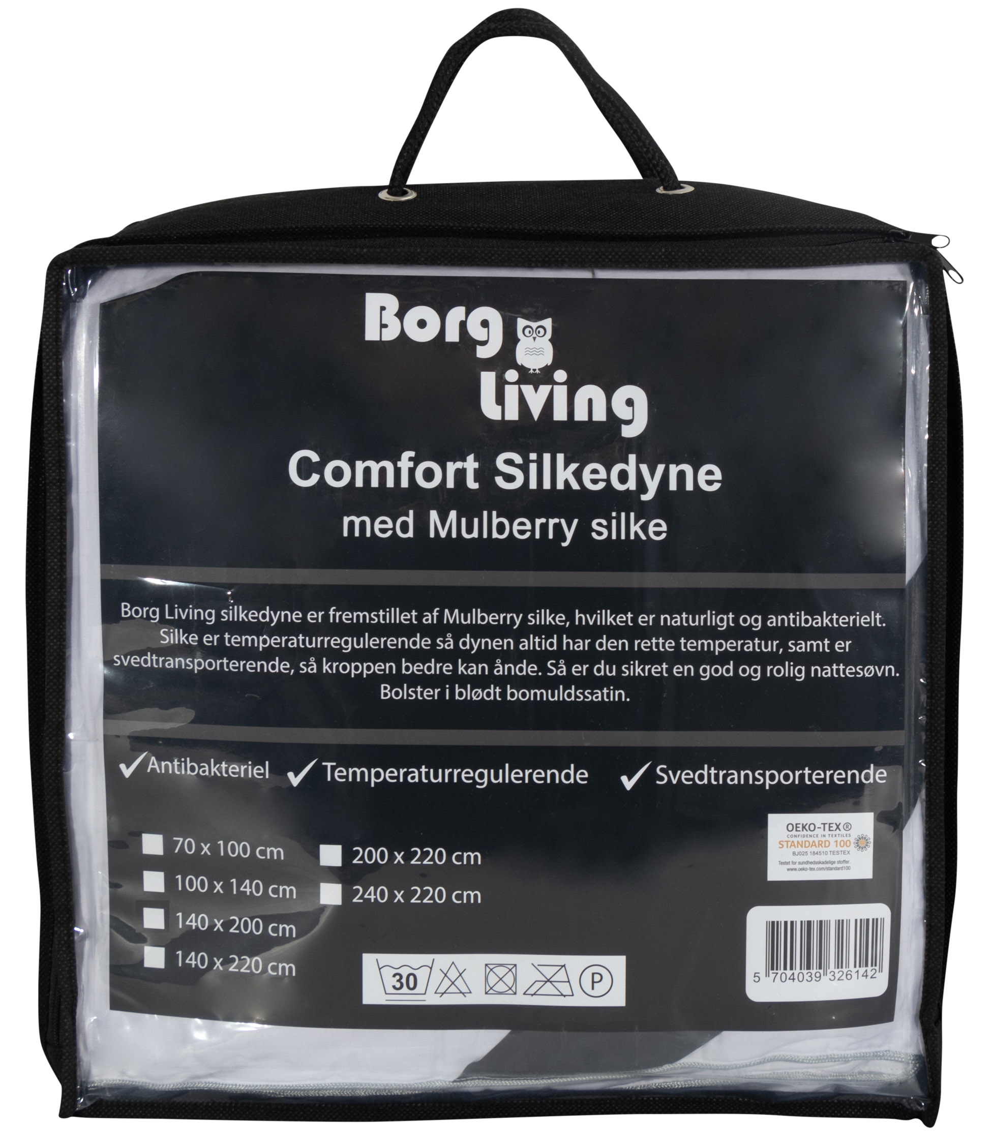 Forside » Dyner » Dyne type » Silke dyner Silke Dobbeltdyne 200x220 cm - 100% Mulberry silke - Temperaturregulerende - Helårs silkedyne Spar55% Borg Living 2.899,951.299,95DKKSpar 1.600,- Gratis fragt på denne varePå lager Trustpilot Antal Læg i kurv Se mere fra: Borg Living Artikelnummer: BL-92 Læs vores dyneguide Læs om vedligeholdelse af dyner og puder Se vores store udvalg af puder Har du spørgsmål til produktet? Silke Dobbelt dyne - Comfort silkFra: Borg LivingMulberry silkefyld Størrelse: 200x220 cm - Dobbelt dyne Type: Helårs silkedyne Brand: Borg Living - Comfort silkedyne Silketæthed: 327g m2 Fyldvægt: 1440g Fyld: 100% Mulberry silke Bolster: Blødt 100% bomuldssatin 60/60 Vask: 30° (Vigtigt at anvende Enzymfrit vaskemiddel) Tørretumbling: Skal liggetørre Leveres i praktisk opbevaringstaske Certificering: STANDARD 100 by OEKO-TEX® (SHHO 053669) Se alle vores silkepuder her Borg Living silkedyne er lavet med Mulberry silke, hvilket er naturligt og antibakterielt. Silke er temperaturregulerende så dynen altid har den rette temperatur, samt er svedtransporterende så kroppen bedre kan ånde. Bolstret er i blødt bomuldssatin. Så er du sikret en god og rolig nattesøvn. Evner: Allergivenlig Anti-bakteriel Væske absorberende og afledende Temperatur regulerende Åndbar Det danske brand Borg Living producerer eksklusive serier af dyner, puder og boligtekstiler til dit hjem. Brandet som er etableret i 2013 og er bl.a. kendt for deres nytænkning indenfor kvalitet og design. Borg Livings fantastiske produkter, bidrager til en optimal og behagelig nattesøvn samt udsmykker dit hjem med moderne og lækkert boligtilbehør. Tilbage til Silke dyner Måske er du også interesseret i: Dobbeltdyne 200x220 cm - Silke dobbelt dyne - Nordic comfort dyne med 100% mulberry silke Silkedyne - Standard silk Fra: Nordic comfort 100% rent Mulberry silkefyld Vejl. udsalgspris : 3.299,95 Spar : 1.500,00 3.299,95 DKK1.799,95 DKK Dobbelt dyne 200x220 cm - silkedyne - Nordic Comfort - Helårs silkedobbeltdyne - 100% langfibret mulberry silkeSilkedyne - Superior silk Fra: Nordic Comfort 100% langfibret mulberry silke Vejl. udsalgspris : 3.499,95 Spar : 1.000,00 3.499,95 DKK2.499,95 DKK