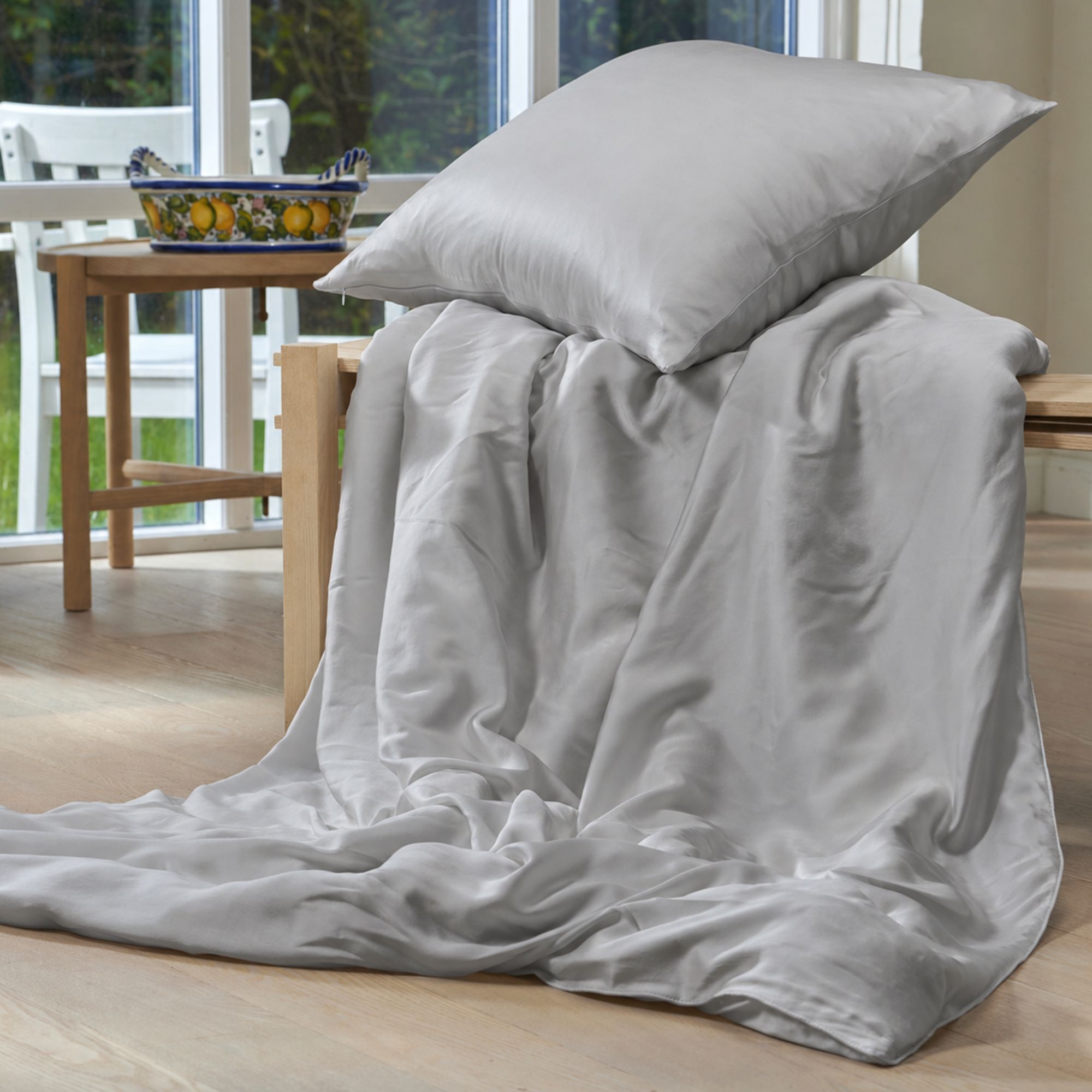 Sengetøjet er fremstillet af fin morbærsilke i en smuk satinvævning med en kvalitet på 19 momme. Silke måles i momme, som angiver tætheden og kvaliteten af vævningen - jo højere momme, desto finere, mere slidstærk og mere eksklusiv silke. Med 19 momme får du en silkekvalitet, der kombinerer lethed, holdbarhed og en silkeblød overflade i perfekt balance.