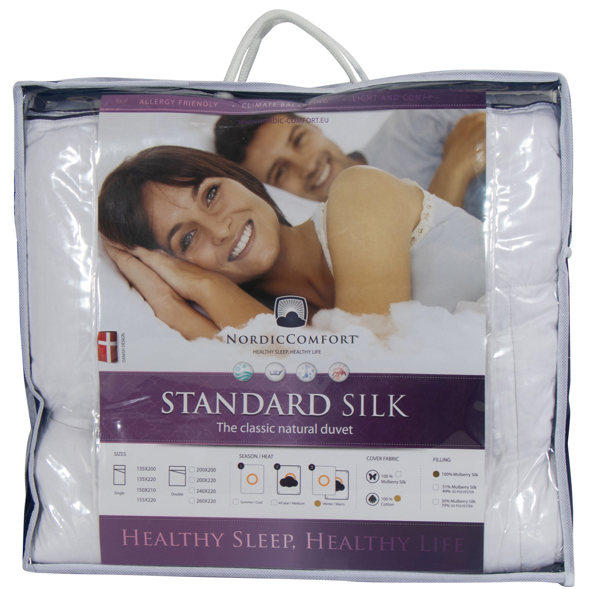 Forside » Dyner » Dyne type » Silke dyner Silkedyne 140x220 cm - Helårsdyne varm - Nordic Comfort dyne med 100% mulberry silke Spar32% Nordic comfort 2.499,951.699,95DKKSpar 800,- Gratis fragt på denne varePå lager Trustpilot Vælg størrelse Vælg variant Antal Læg i kurv Se mere fra: Nordic comfort Artikelnummer: 0071 Læs vores dyneguide Læs om vedligeholdelse af dyner og puder Se vores store udvalg af puder Har du spørgsmål til produktet? Silkedyne - Standard silkFra: Nordic comfort100% rent Mulberry silkefyld Størrelse: 140x220 cm - Ekstra længde Type: Varm silkedyne Brand: Nordic Comfort - Standard Silk Silketæthed: 425 g m2 Fyldvægt: 1300 g Fyld: 100% mulberry silke Bolster: Blødt bomulds super cambric Vask: Ja maskinvaskes (Vigtigt at anvende Enzymfrit vaskemiddel) Garanti: 5 år Leveres i eksklusiv bæretaske Certificering: Crossvent og silkFX Certificering: STANDARD 100 by OEKO-TEX® (SHHO 090844) Se alle vores silkepuder her Silkedynen er lavet af SilkFX, som er 100% Mulberry silkefyld og med 100% bomuldsvår udenpå. Morbær silke anses som den bedste type silke til at producere dyner af. Silk Standard dynen er med SilkFX teknologi, så du nemt kan vaske dynen hjemme. Vi anbefaler Silk Standard til dig, som ønsker den originale silkedyne, hvor du får absolut mest ud af de gode egenskaber. Denne silkedyne har 5 års garanti. Nordic Comfort® er Danmarks mest solgte type silkedyne! Det er der selvfølgelig en grund til. Evner: Luksuriøs silkefiber Oplev det ultimativ inden for sovemiljø Temperaturregulerende Forbedrer sund og dyb søvn som tilpasser sig din kropstemperatur Allergivenlig Afviser husstøvmider og allergener - mindre allergiske reaktioner Antibakteriel Renere og sundere sovemiljø Fugtabsorberende Reducerer nattesved og fugtigt sovemiljø Åndbar Lader din krop ånde naturligt og reducerer natlige overophedning Nordens mest solgte silkeprodukter er fra Nordic Comfort. Brandet er stiftet i 2007, og har til formål at producere et lækkert silkesortiment i allerhøjeste kvalitet til forbrugeren. Så du med hjælp fra deres søvneksperter, kan opnå en optimal og forbedret nattesøvn. Tilbage til Silke dyner