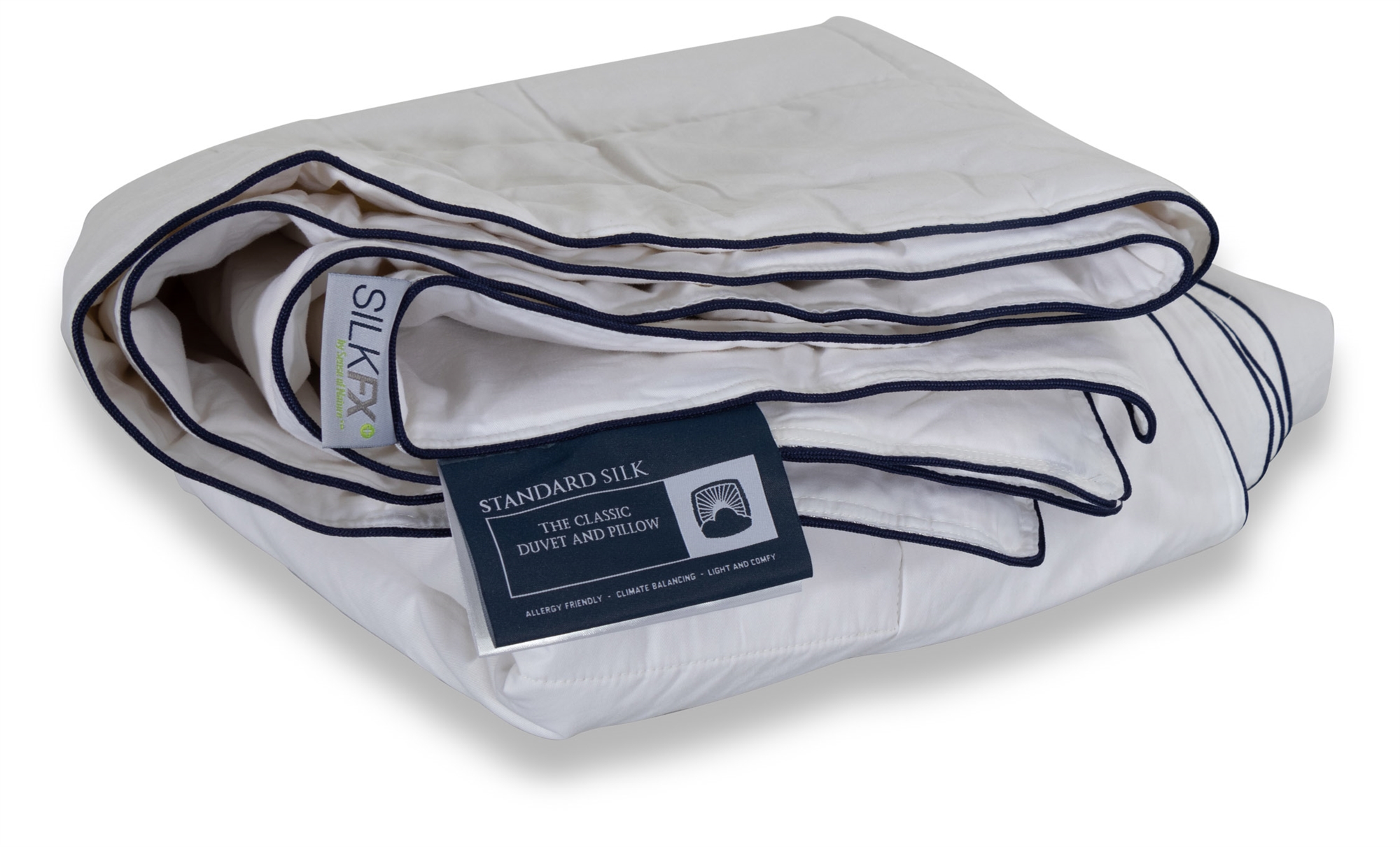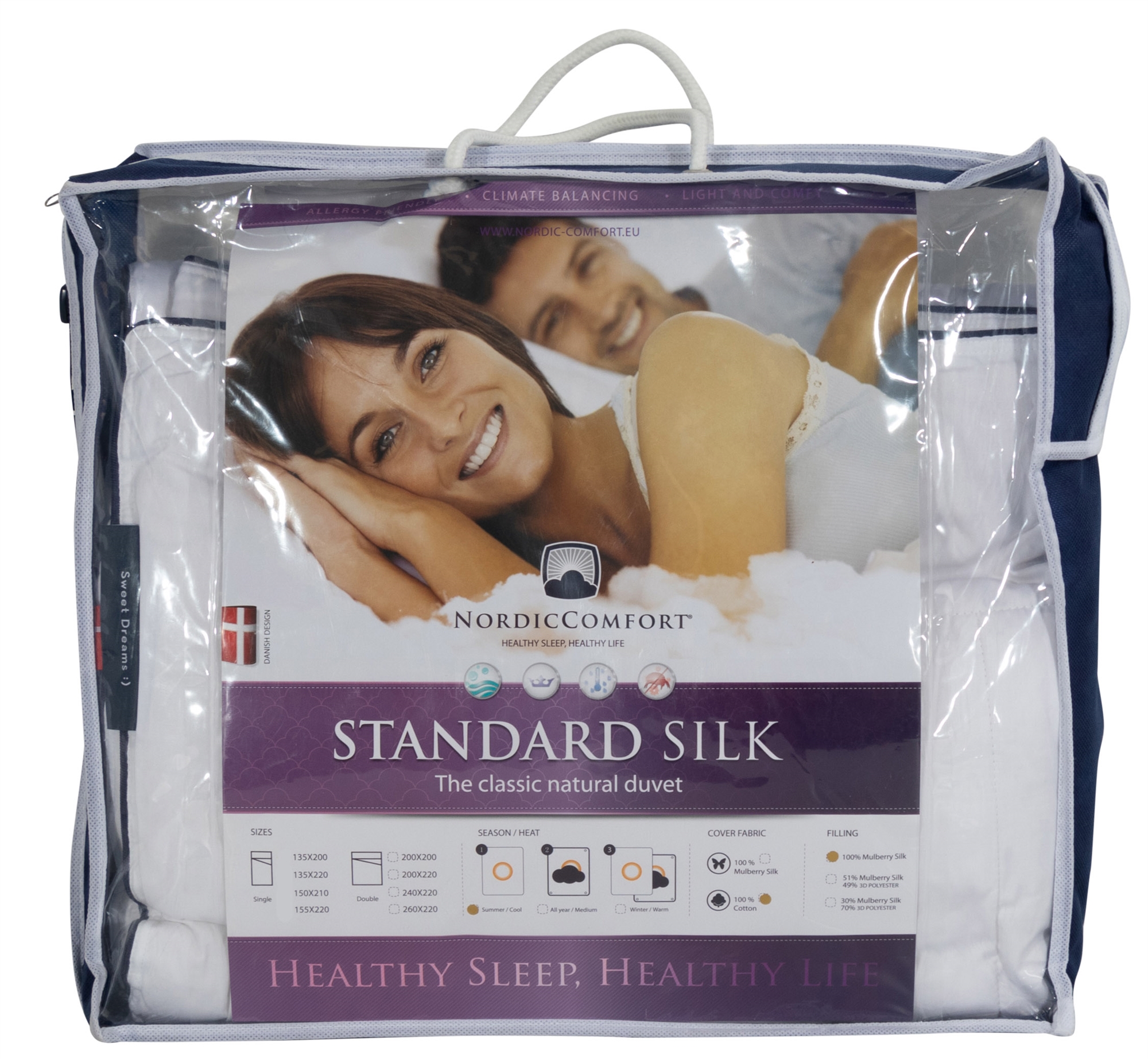 Forside » Dyner » Dyne type » Silke dyner Sommer silkedyne 140x200cm - Sval sommerdyne med 100% mulberry silke fyld - Nordic comfort dyne Spar47% Nordic comfort 1.499,95799,95DKKSpar 700,- Gratis fragt på denne varePå lager Trustpilot Vælg størrelse Vælg variant Antal Læg i kurv Se mere fra: Nordic comfort Artikelnummer: 7301 Læs vores dyneguide Læs om vedligeholdelse af dyner og puder Se vores store udvalg af puder Har du spørgsmål til produktet? Sommerdyne - Nordic ComfortLeveres med eksklusiv bæretaske100% rent Mulberry silkefyld Størrelse: 140x200 cm enkelt dyne Type: Sommerdyne - sval dyne Brand: Nordic Comfort - Nordic Comfort - Standard-Silk silkedyne Silketæthed: 150 g m2 Fyldvægt: 405 g Fyld: 100% mulberry silke Bolster: Blødt bomulds super cambric 80/80 Vask: Ja maskinvaskes (Vigtigt at anvende Enzymfrit vaskemiddel) Garanti: 5 år Certificering: Crossvent og SilkFX Certificering: STANDARD 100 by OEKO-TEX® (SHHO 090844) Leveres med eksklusiv bæretaske Se alle vores silkepuder her Silkedynen er lavet af SilkFX, som er 100% Mulberry silkefyld og med 100% bomuldsvår udenpå. Silk Standard sommer dynen er med SilkFX teknologi, så du nemt kan vaske dynen hjemme. Vi anbefaler Silk Standard til dig, som ønsker den originale silkedyne, hvor du får absolut mest ud af de gode egenskaber. Denne silkedyne har 5 års garanti. Nordic Comfort® er Danmarks mest solgte type sommer silkedyne! Det er der selvfølgelig en grund til. Evner: Luksuriøs silkefiber Oplev det ultimativ inden for sovemiljø Temperaturregulerende Forbedrer sund og dyb søvn som tilpasser sig din kropstemperatur Allergivenlig Afviser husstøvmider og allergener - mindre allergiske reaktioner Antibakteriel Renere og sundere sovemiljø Fugtabsorberende Reducerer nattesved og fugtigt sovemiljø Åndbar Lader din krop ånde naturligt og reducerer natlige overophedning Nordens mest solgte silkeprodukter er fra Nordic Comfort. Brandet er stiftet i 2007, og har til formål at producere et lækkert silkesortiment i allerhøjeste kvalitet til forbrugeren. Så du med hjælp fra deres søvneksperter, kan opnå en optimal og forbedret nattesøvn. Tilbage til Silke dyner