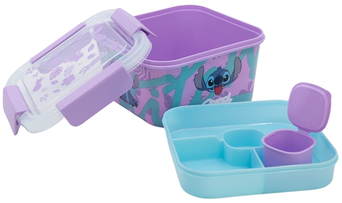 Stitch madkassen er en praktisk og sikker løsning til dit barns frokost. Med et flot design, er det en madkasse, der vil glæde ethvert barn. Madkassen er opdelt i 6 rum, hvilket gør det nemt at adskille forskellige typer mad, en praktisk løsning til en varieret frokost. Madkassen har et stort rum, hvor man ovenpå kan sætte en fordeler, som har 5 forskellige rum. I midterste rum er der plads til den lille tilhørende bøtte.