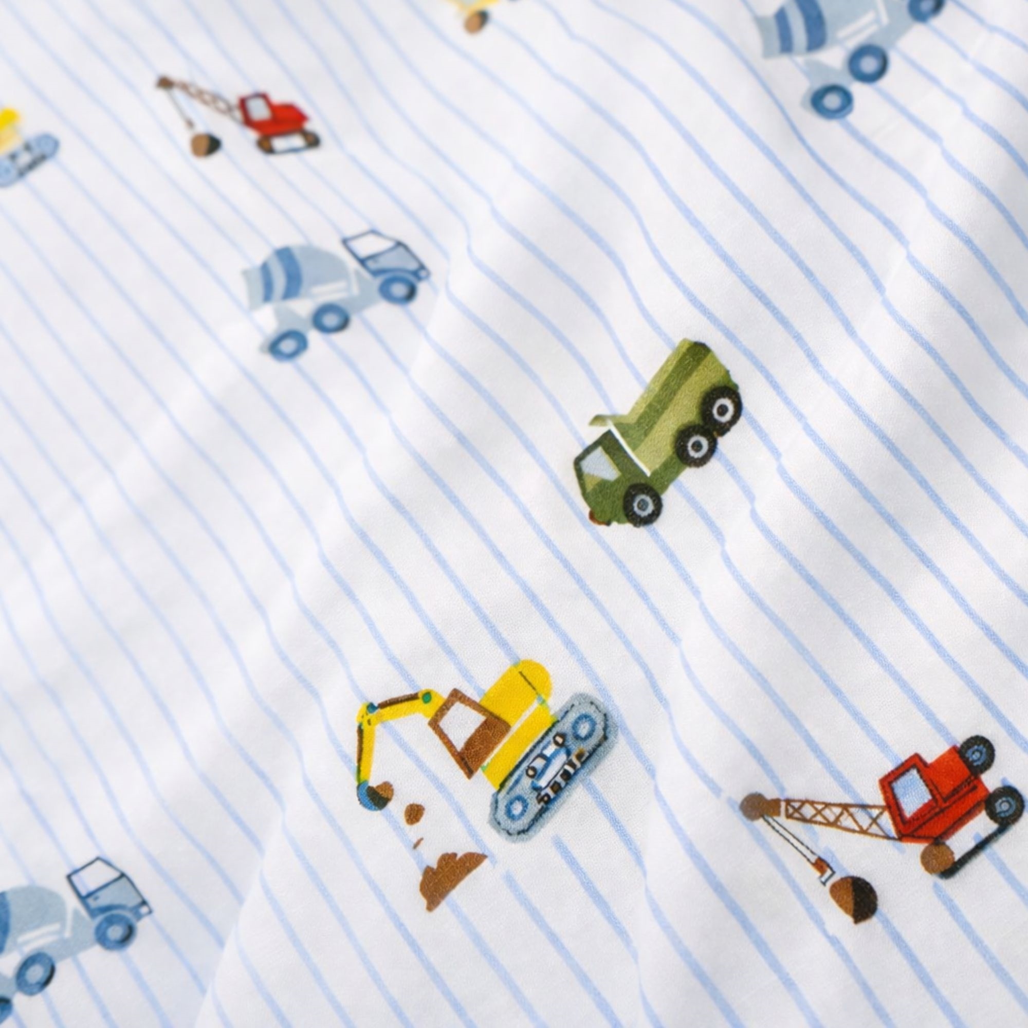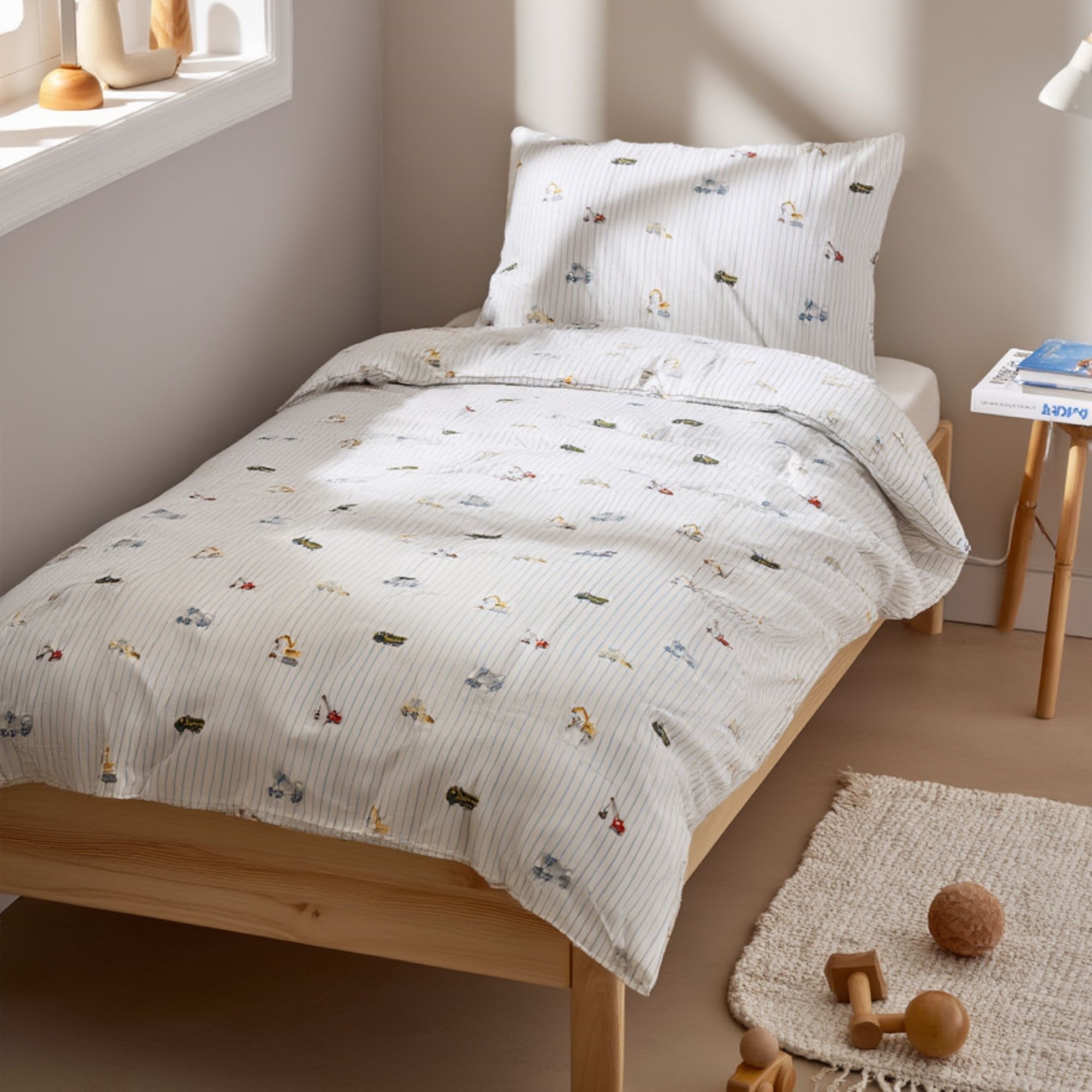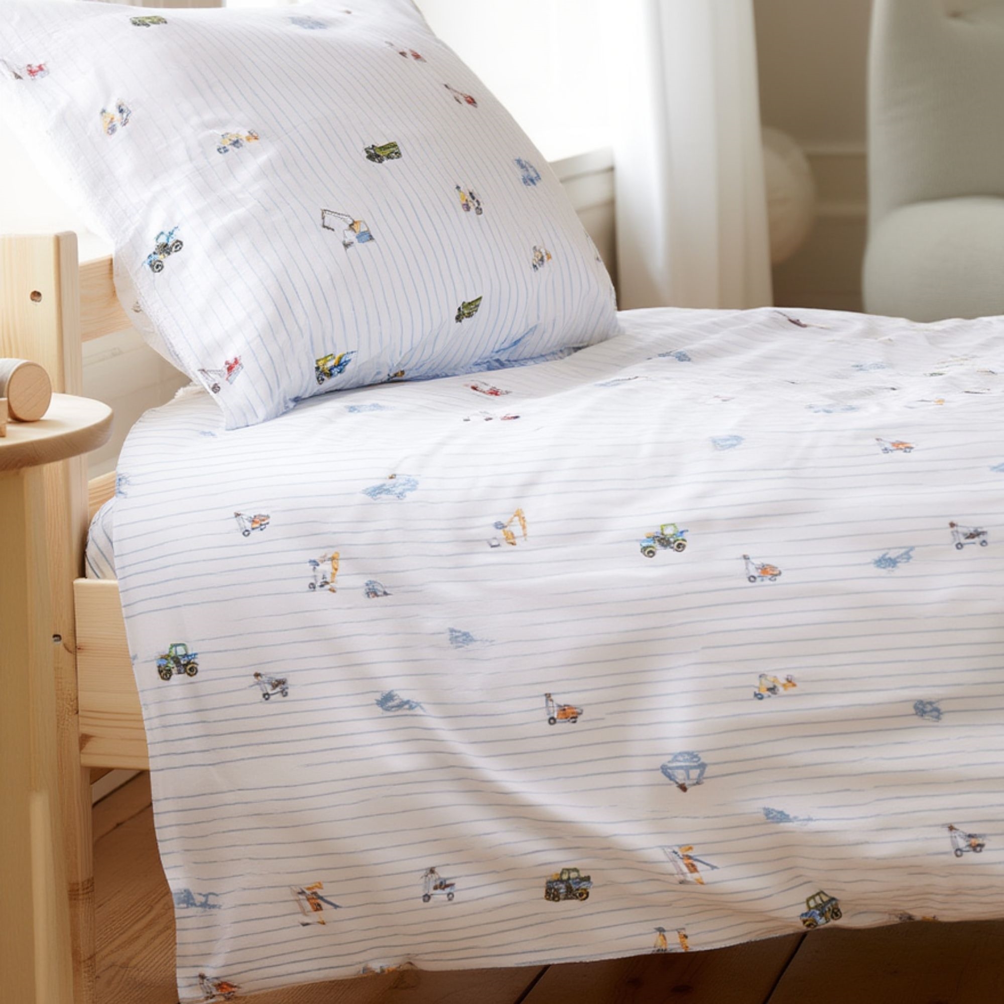 By Mats junior sengetøj 100x140 cm - hvid med blå striber og arbejdsmaskiner
