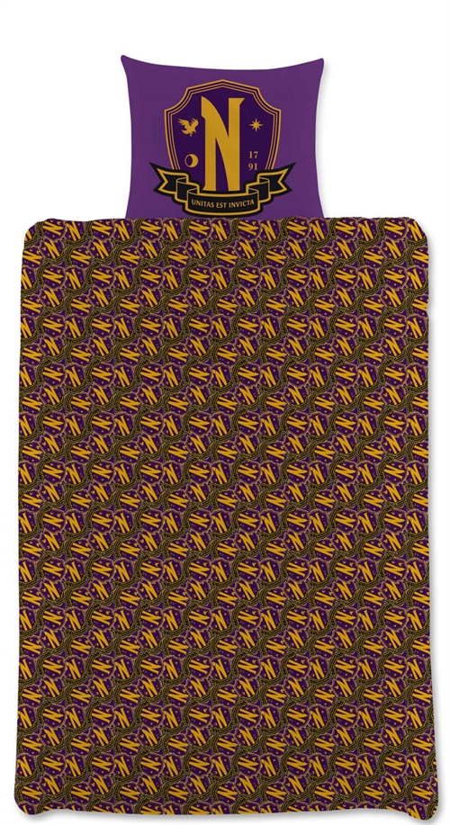 Giv soveværelset et mystisk og stilfuldt look med dette flotte Wednesday sengetøj. Sættet er i en lilla farve og har et vendbart design, så du nemt kan skifte udtryk i sengen. På forsiden ses Wednesday Addams og Enid Sinclair, mens bagsiden har et flot fuldprintet logo design. Perfekt til fans af det populære univers.
